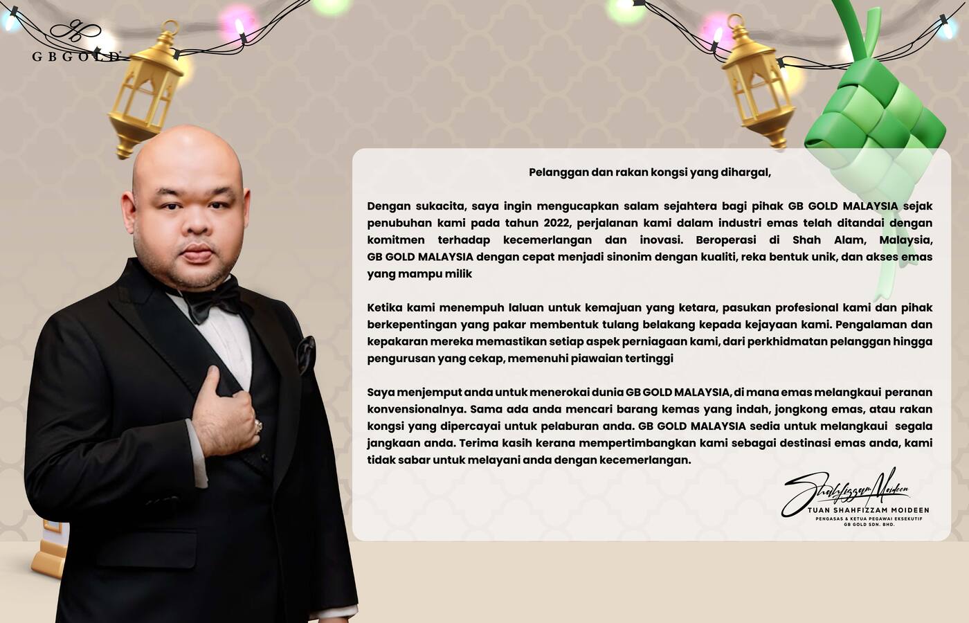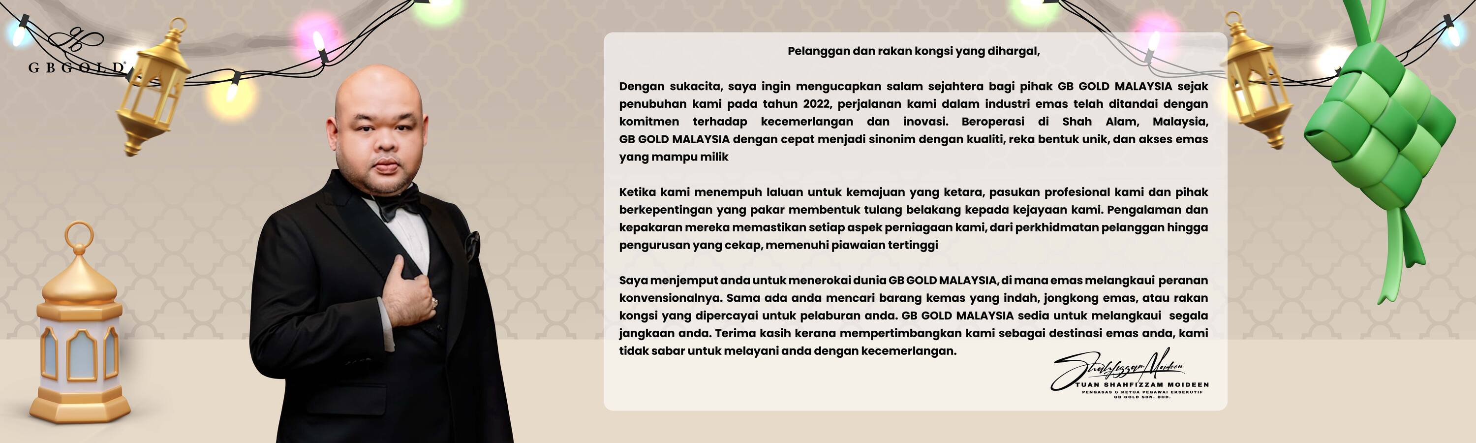 It is with great pleasure that I extend my heartfelt greetings on behalf of GB GOLD. Since our inception in 2023, our journey in the gold industry has been one defined by a commitment to excellence and innovation. Situated in Shah Alam, Malaysia, GB GOLD has quickly become synonymous with quality, unique designs, and affordable access to gold.