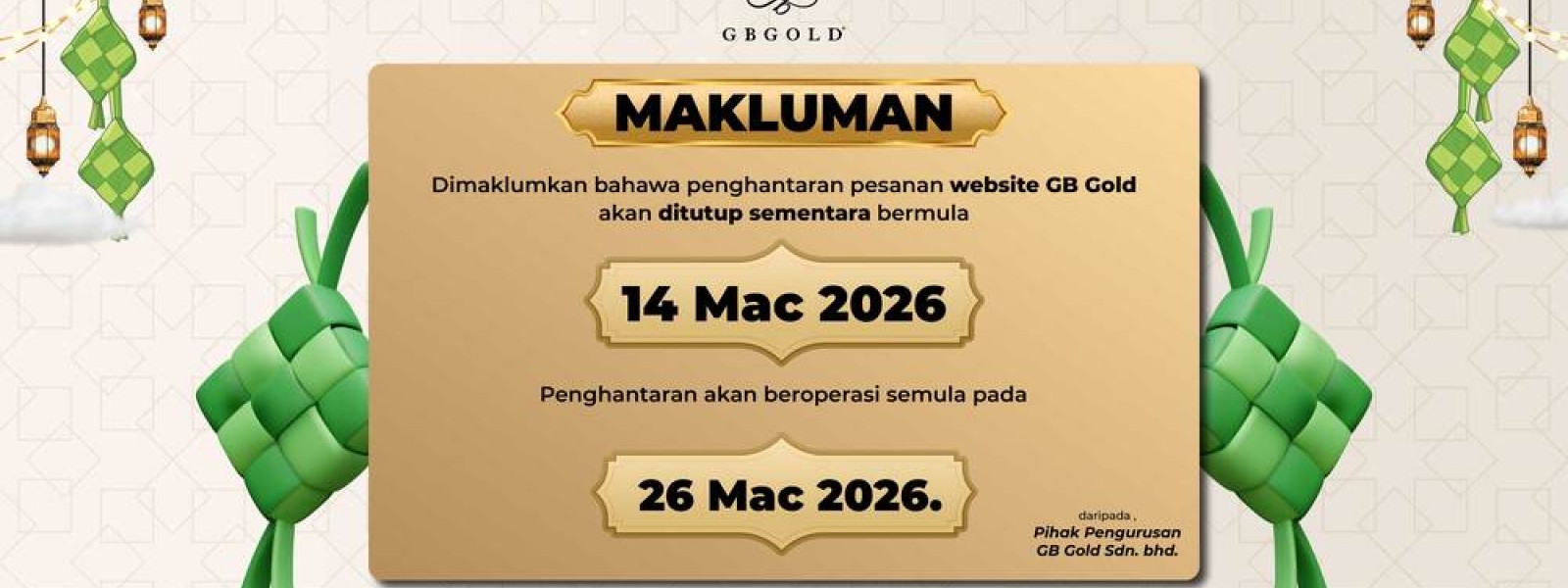 Syarikat GB Gold Sdn. Bhd. (GB Gold Malaysia) akan menutup sementara operasi pada hari Sabtu (13 Disember 2025). Operasi akan berjalan seperti biasa pada hari Isnin (15 Disember 2025). Segala urusan pembelian dalam talian ...
