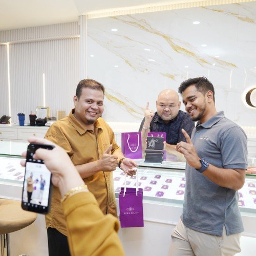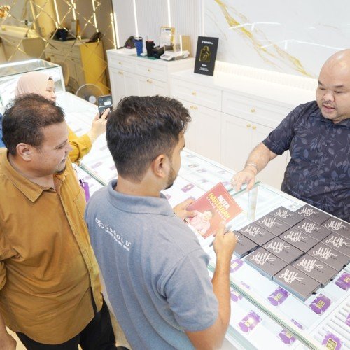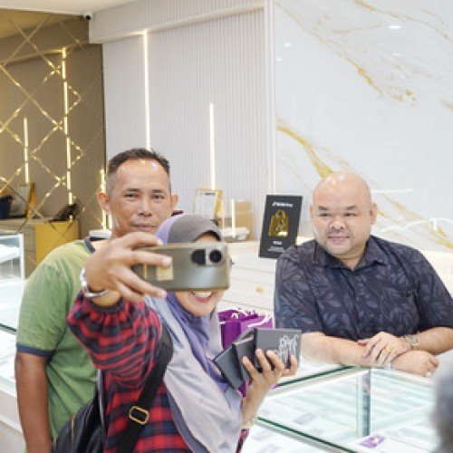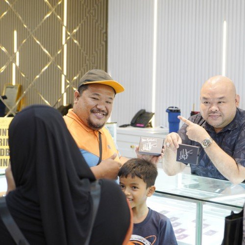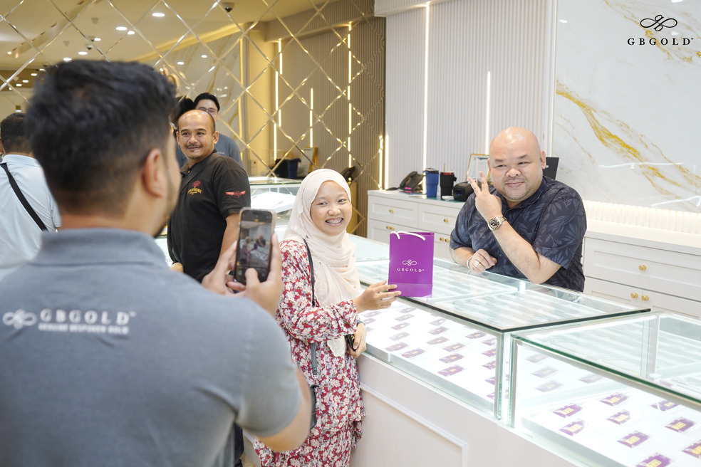 Pelanggan yang hadir bukan hanya dapat membeli produk Emas Alif, malah dapat bergambar kenangan bersama Pengasas dan Ketua Pagawai Eksekutif Grand Bullion Gold Sdn. Bhd. (GB Gold Malaysia) dan Duta GB Gold, Alif Satar.