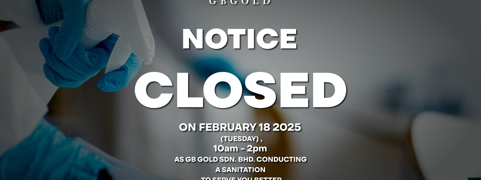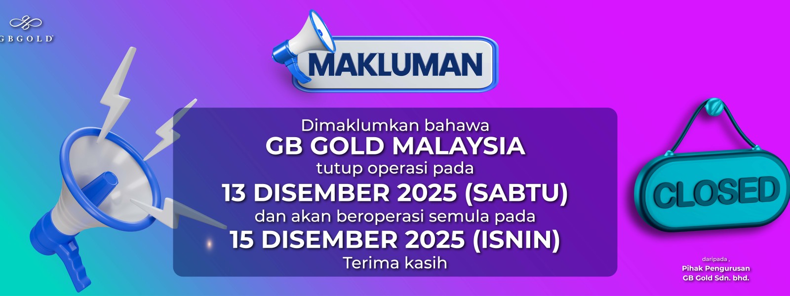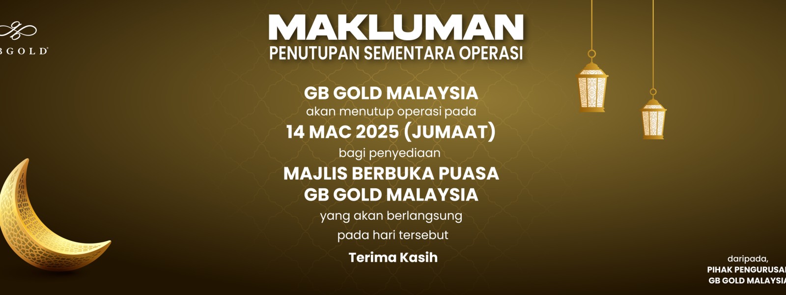Makluman kepada semua pelanggan yang dihormati, Syarikat GB Gold Sdn. Bhd. (GB Gold Malaysia) akan menutup sementara operasi pada 14 Mac 2025 (Jumaat). Penutupan tersebut adalah bagi memberi laluan kepada ...