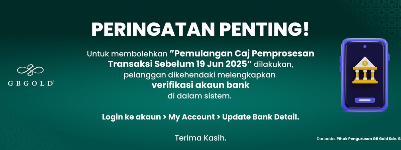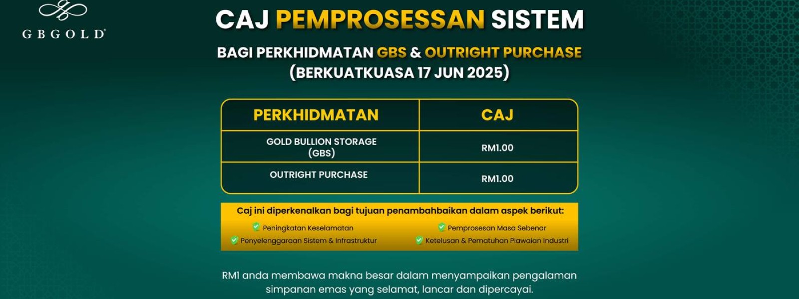 Makluman kepada semua pelanggan,.Syarikat GB Gold Sdn. Bhd. (GB Gold Malaysia) mengambil maklum dan merujuk kepada notis bertarikh 19 Jun 2025 mengenai Caj Pemprosesan Transaksi, RM1 yang berkuatkuasa kebelakangan..Justeru, atas ...