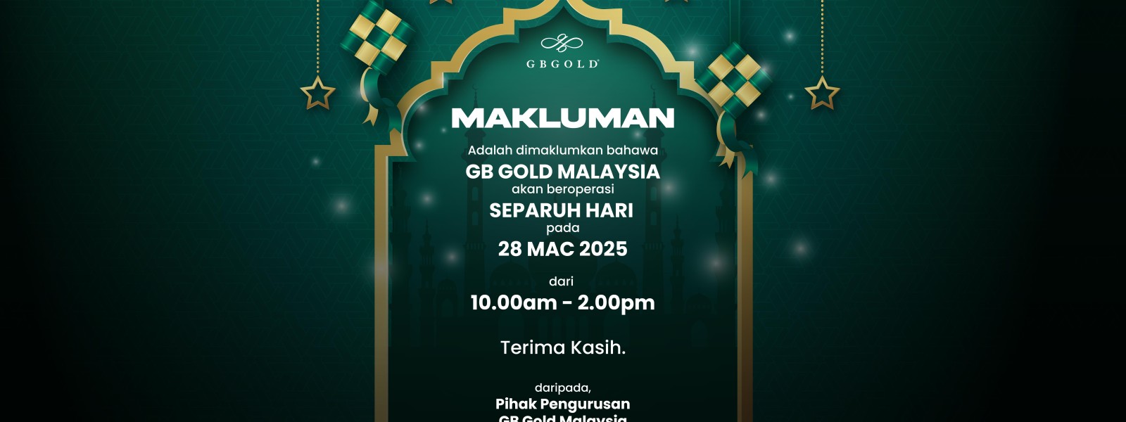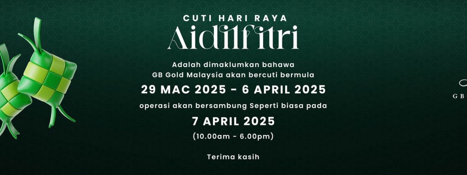 Makluman kepada semua pelanggan, Syarikat GB Gold Sdn. Bhd. (GB Gold Malaysia) akan menutup sementara operasi sempena Hari Raya Aidilfitri bermula 29 Mac hingga 6 April 2025. Syarikat akan beroperasi semula ...