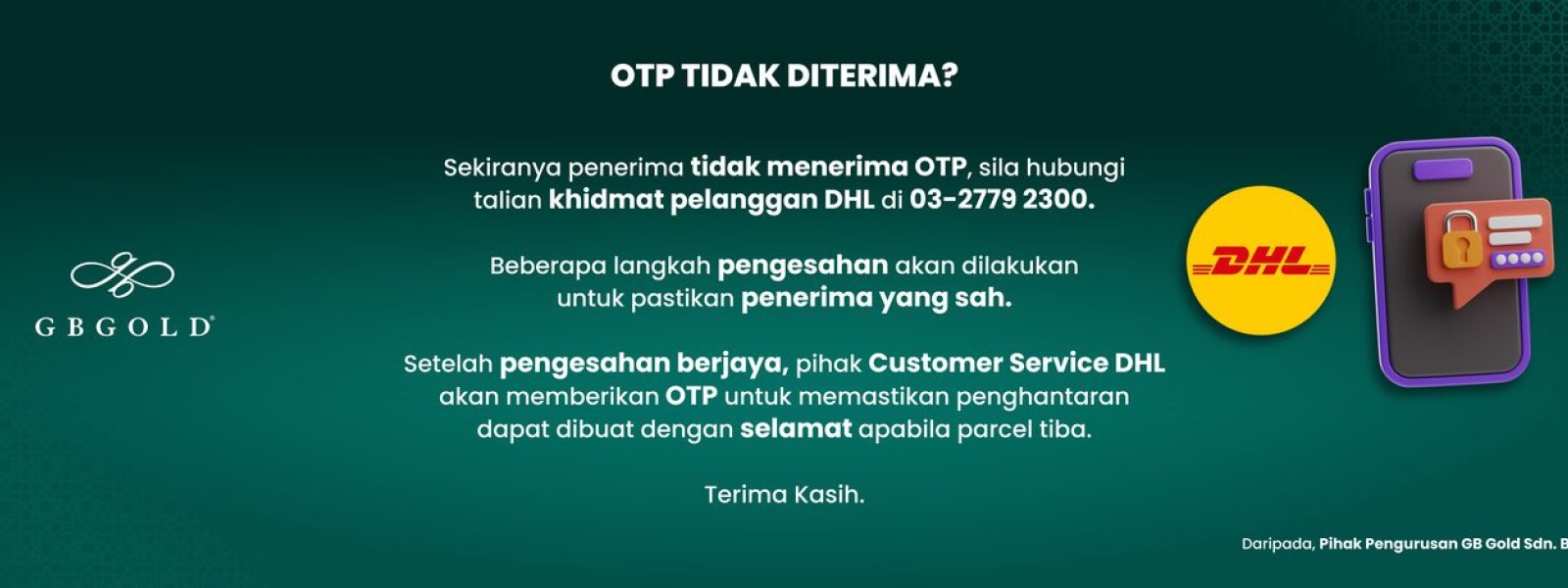 Makluman kepada semua pelanggan,.Pelanggan yang memilih penghantaran berinsurans (standard shipping + insurans), syarikat GB Gold Sdn. Bhd. (GB Gold Malaysia) ingin mengingatkan anda mendapatkan nombor OTP ( One Time Password) daripada ...