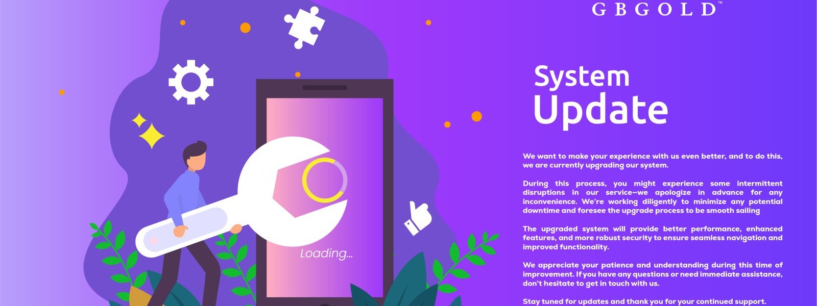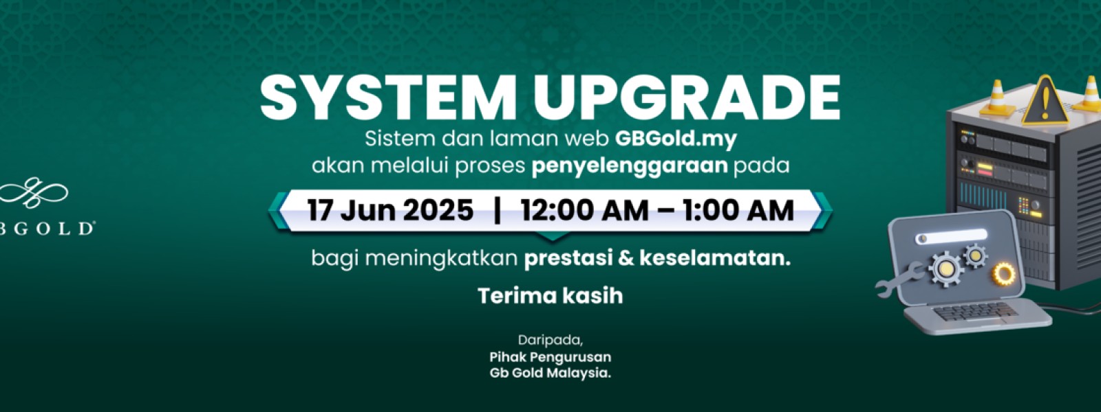 Kepada semua pelanggan GB Gold Sdn. Bhd. (GB Gold Malaysia) yang dihormati,Pihak syarikat akan memulakan proses penyelenggaraan dan peningkatan kecekapan fungsi sistem pada malam ini (17 Jun 2025)Proses tersebut ...