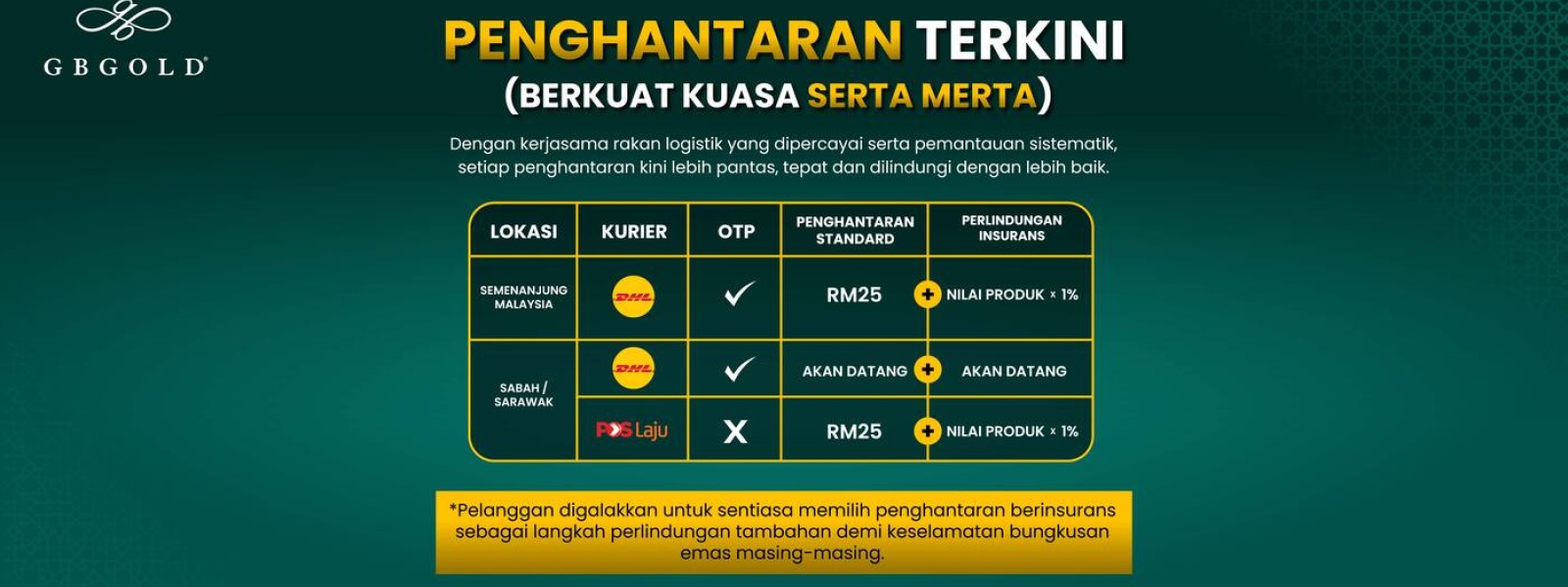 Berita baik buat semua pelanggan GB Gold Malaysia. Penghantaran bungkusan pesanan anda kini lebih selamat dan efisien dengan jaminan tinggi. Sejajar dengan komitmen GB Gold Malaysia untuk menyediakan perkhidmatan ...
