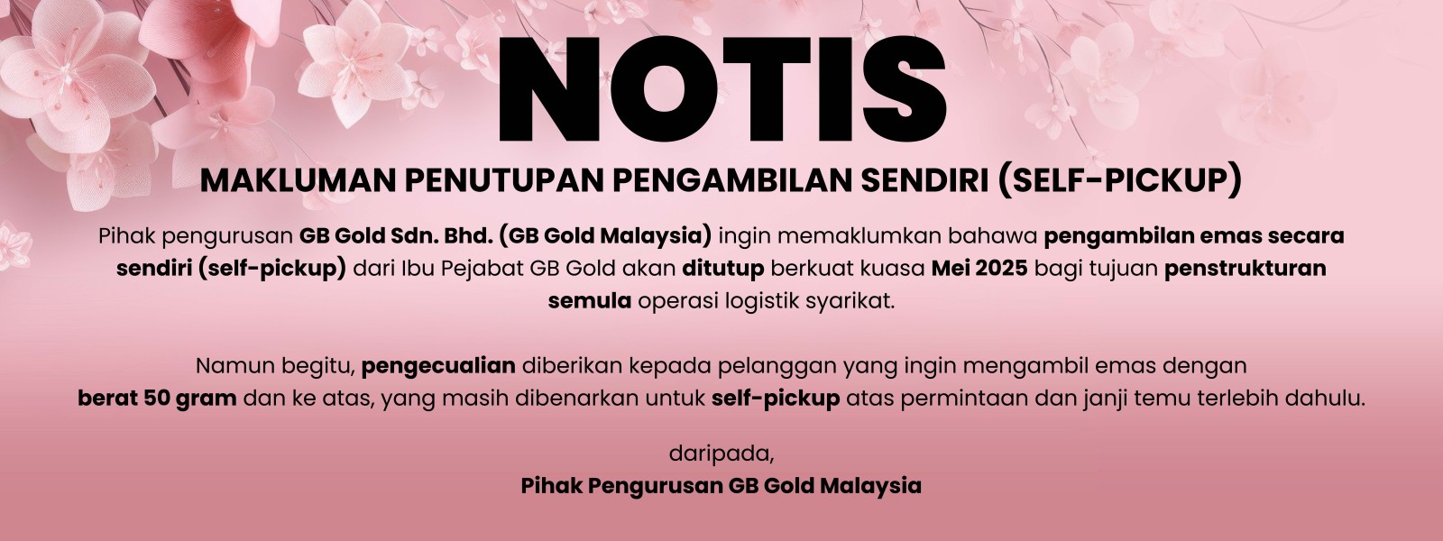 Makluman Penutupan Pengambilan Sendiri (Self-Pickup)Assalamualaikum warahmatullahi wabarakatuh dan Salam Sejahtera, Dengan segala hormatnya perkara di atas adalah dirujuk.Pihak pengurusan GB Gold Sdn. Bhd. (GB Gold Malaysia) ingin ...