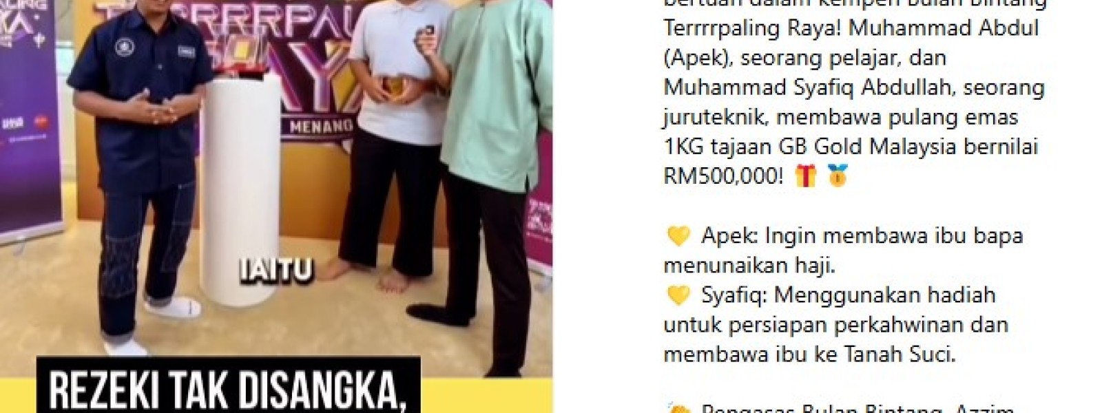 Tuah berpihak kepada dua pemenang bertuah dalam kempen Bulan Bintang Terrrrpaling Raya! Muhammad Abdul (Apek), seorang pelajar, dan Muhammad Syafiq Abdullah, seorang juruteknik, membawa pulang emas 1KG tajaan GB ...