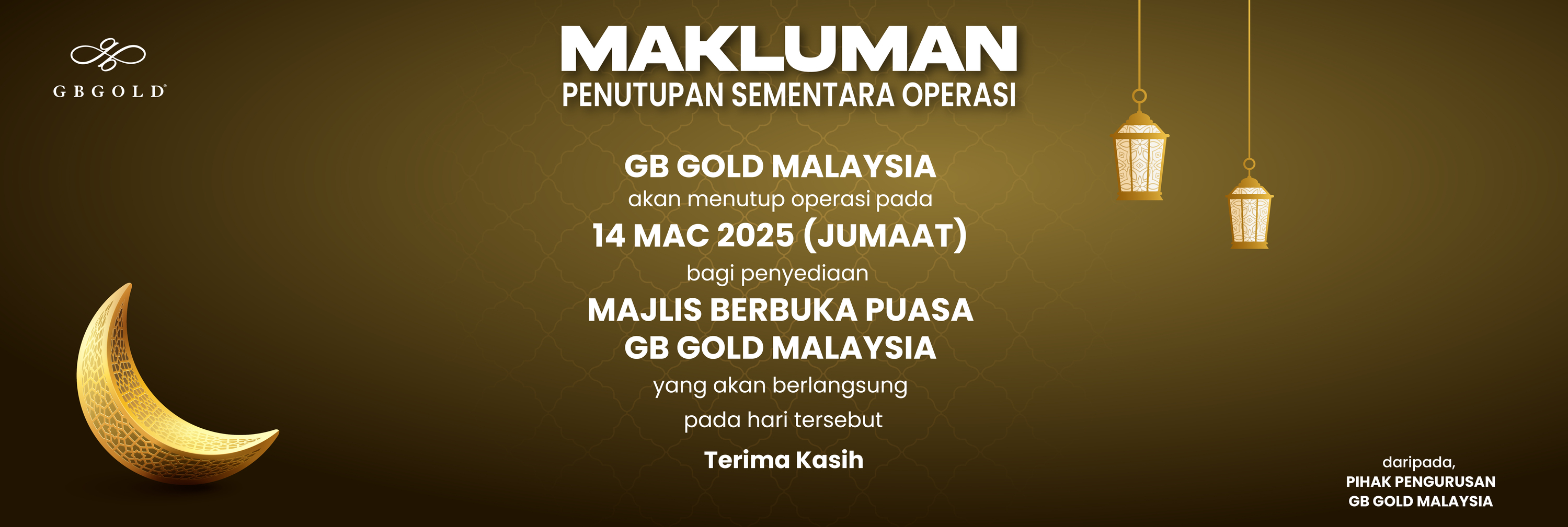 Penutupan tersebut adalah bagi memberi laluan kepada kakitangan GB Gold Malaysia membuat persediaan Majlis Berbuka Puasa GB Gold Malaysia yang akan berlangsung pada hari tersebut.