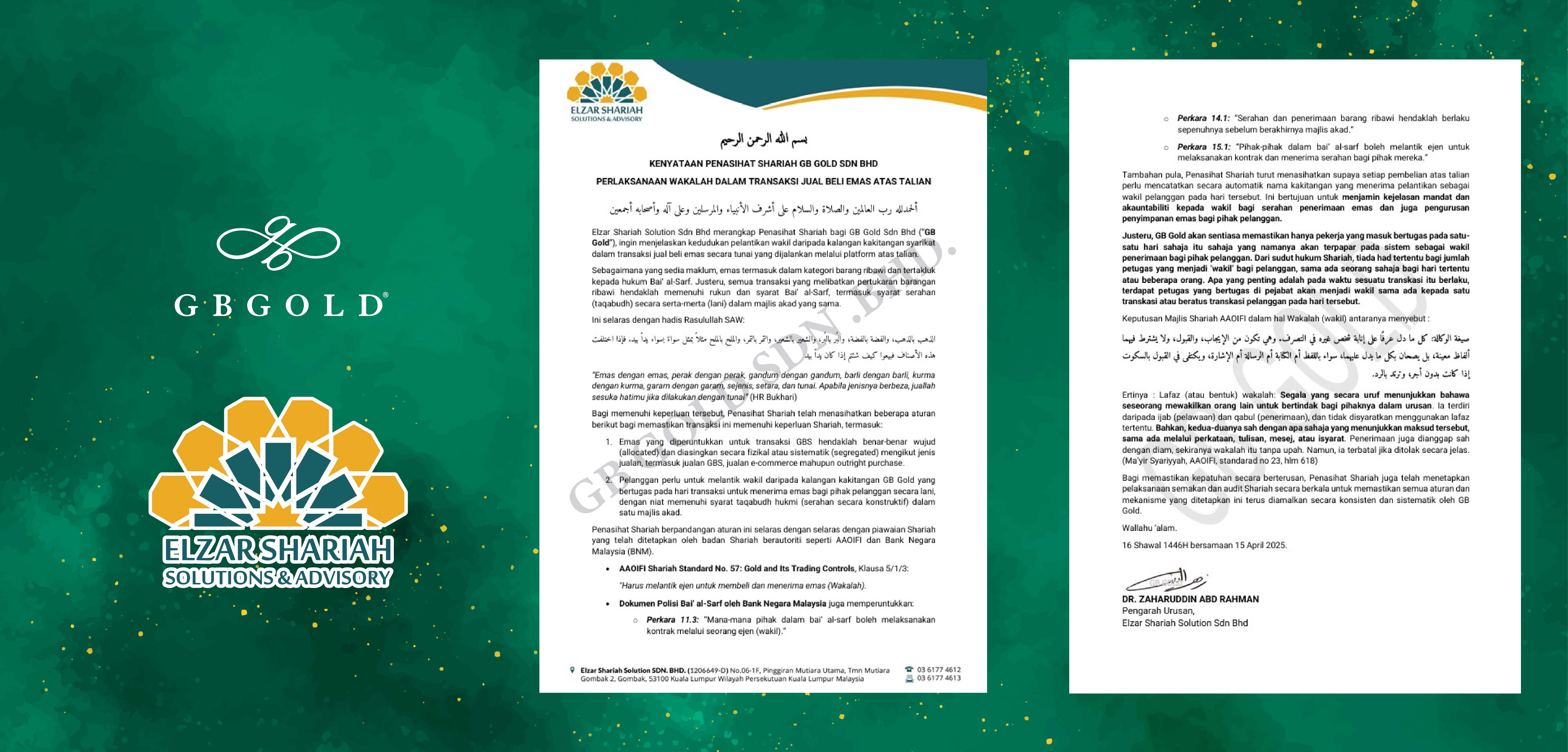 Pengarah Urusan Elzar Shariah Solution Sdn. Bhd., Dr. Zaharuddin Abd. Rahman selaku Penasihat Shariah kepada GB Gold Malaysia mengesahkan perlantikan daripada kalangan kakitangan syarikat dalam urusan transaksi jual beli emas secara dalam talian yang dijalankan melalui platform atas talian adalah mengikut garis panduan dan kehendak Shariah.