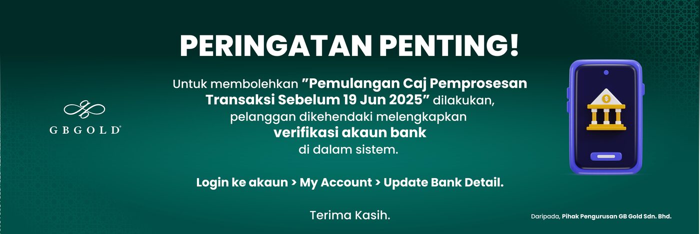 Bagi membolehkan pemulangan Caj Pemprosesan Transaksi pembelian emas secara outright dan GBS sebelum 19 Jun 2025, pelanggan terlibat dinasihatkan agar melengkapkan segera verifikasi akaun bank dalam sistem.