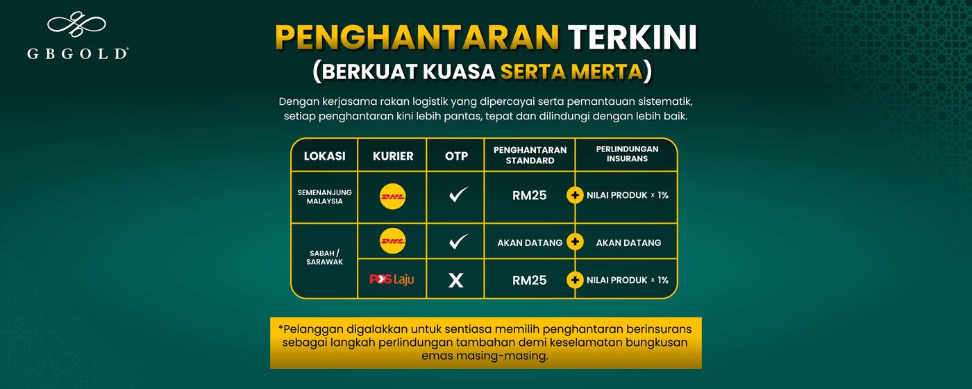 Berita baik buat semua pelanggan GB Gold Malaysia. Penghantaran bungkusan pesanan anda kini lebih selamat dan efisien dengan jaminan tinggi.