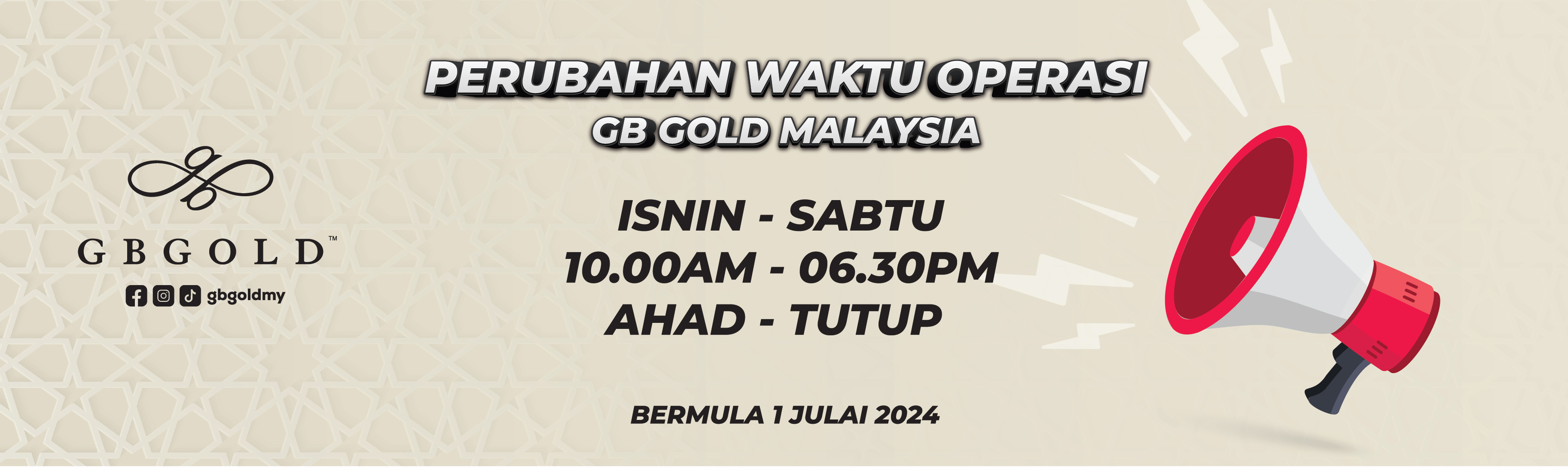 Bermula 1 Julai 2024, waktu operasi Syarikat Grand Bullion Gold Sdn. Bhd. (GB Gold Malaysia) berubah kepada: