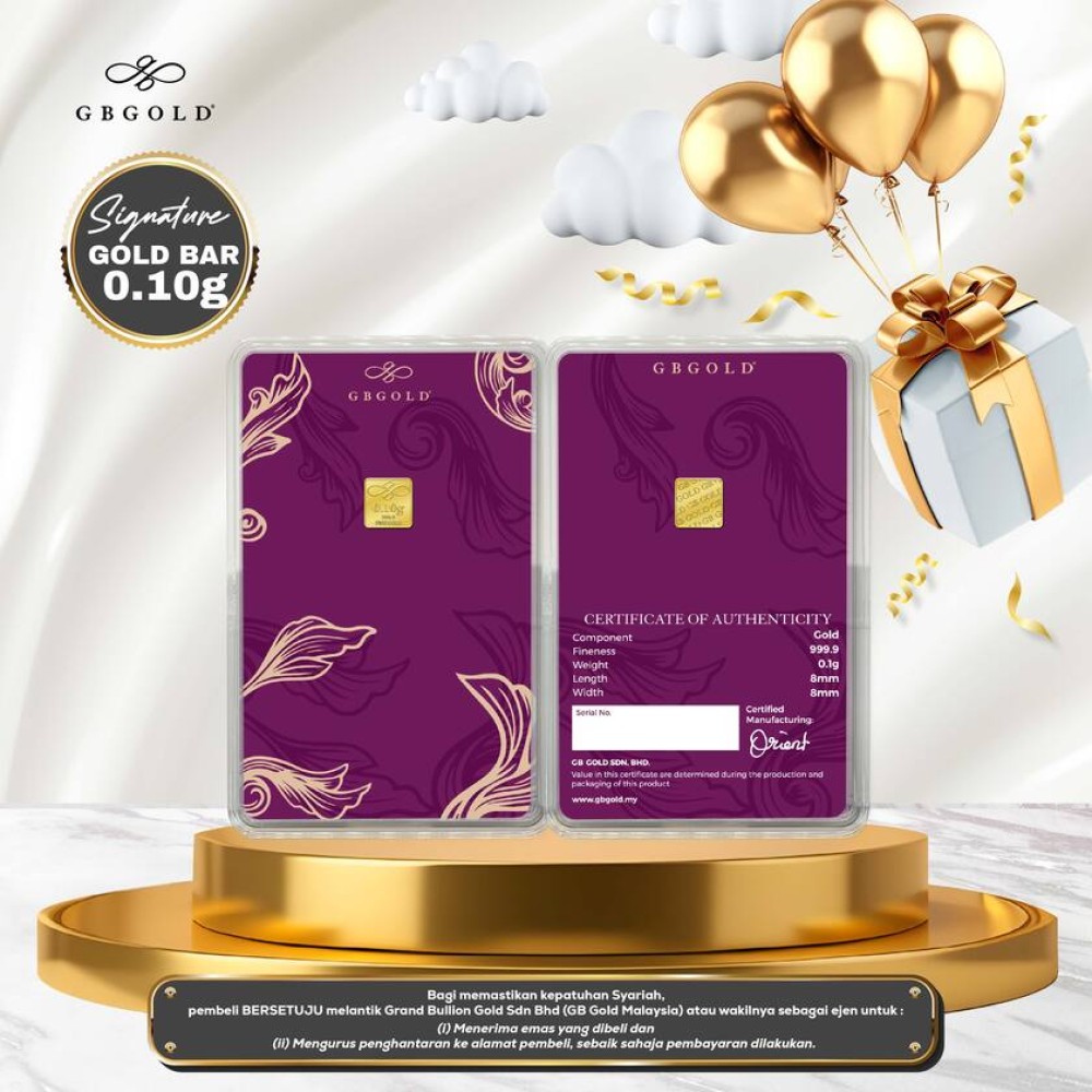 Introducing the GB GOLD Signature Gold Bar 0.1g (Emas 999.9), the perfect addition to your collection of gold decorations and accessories. Crafted with 999.9/24K purity, this gold bullion bar is a must-have for any discerning collector.