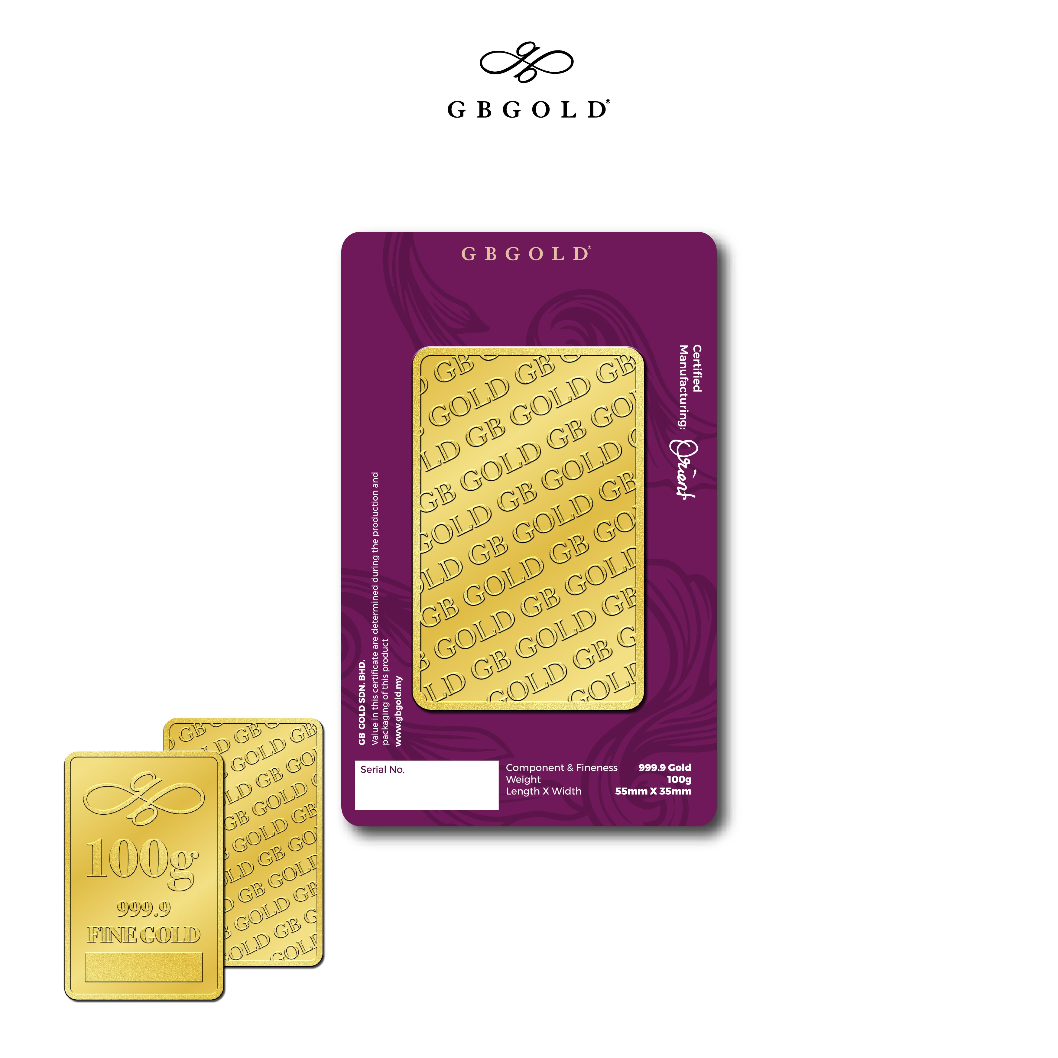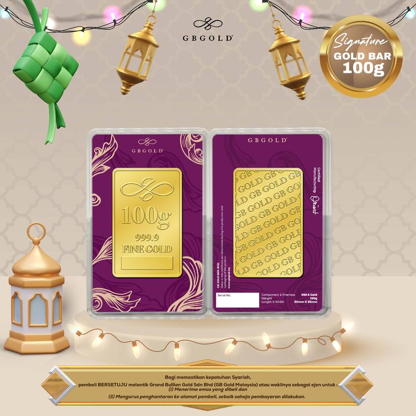 Introducing the GB GOLD Signature Gold Bar 100g (Emas 999.9), the perfect addition to your collection of gold decorations and accessories. Crafted with 999.9/24K purity, this gold bullion bar is a must-have for any discerning collector.