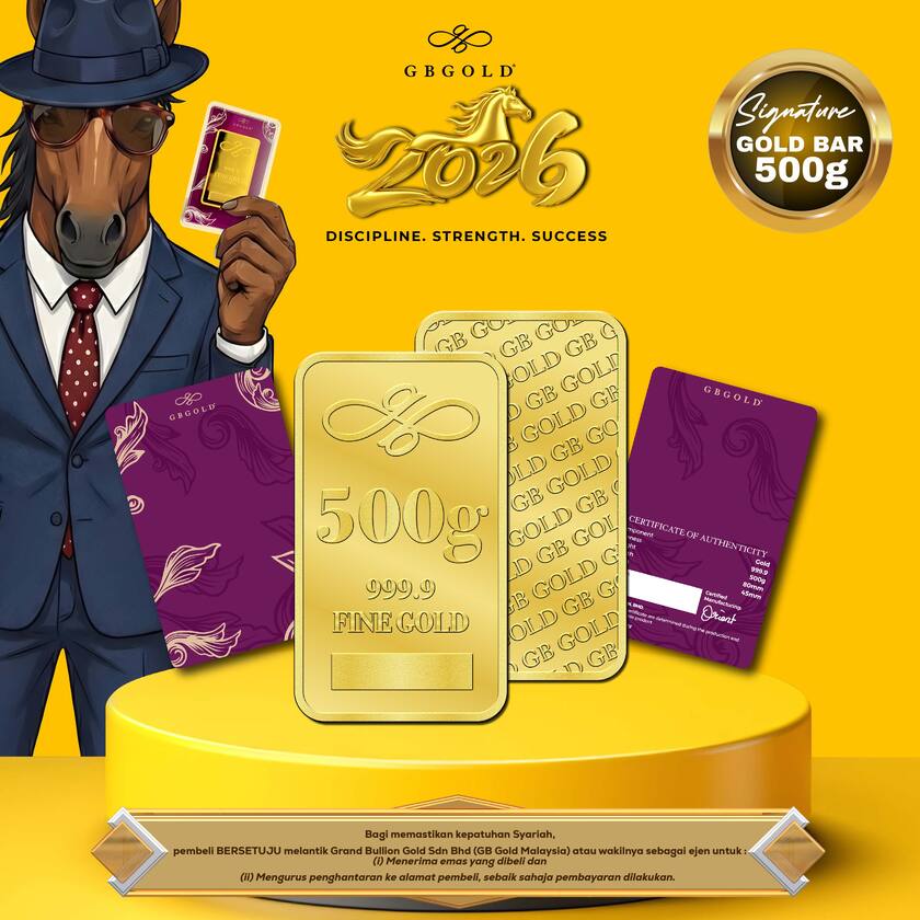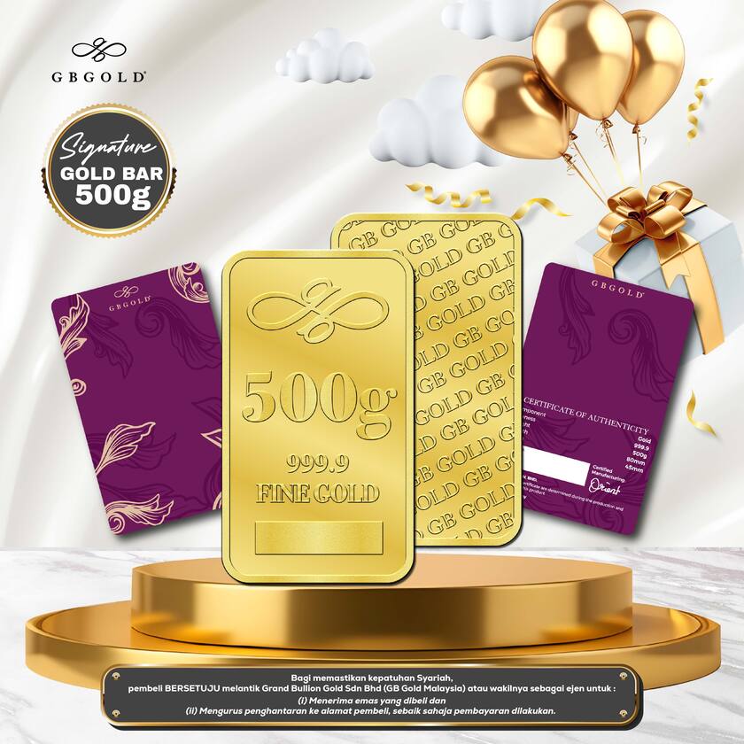 Introducing the GB GOLD Signature Gold Bar 500g (Emas 999.9), the perfect addition to your collection of gold decorations and accessories. Crafted with 999.9/24K purity, this gold bullion bar is a must-have for any discerning collector.