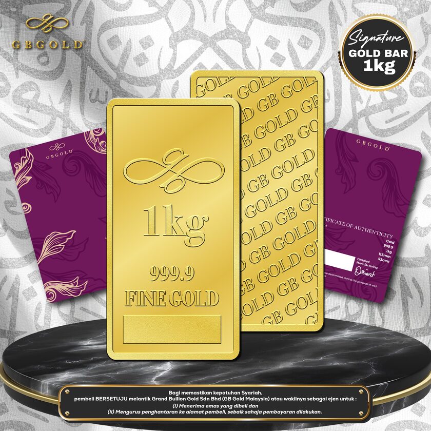 Introducing the GB GOLD Signature Gold Bar 1000g (Emas 999.9), the perfect addition to your collection of gold decorations and accessories. Crafted with 999.9/24K purity, this gold bullion bar is a must-have for any discerning collector.