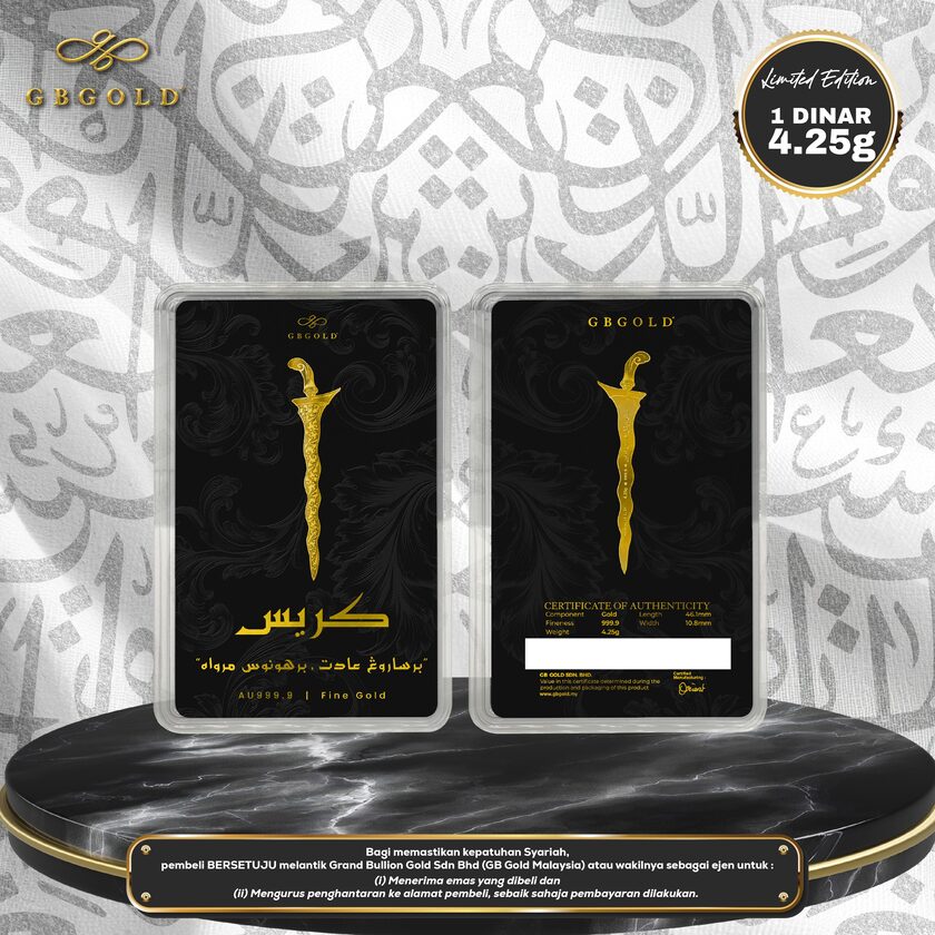 Introducing the GB Gold Keris 1 Dinar 4.25gm (Emas 999.9), the perfect addition to your collection of gold decorations and accessories. Crafted with 999.9/24K purity, this gold dinar is a must-have for any discerning collector.