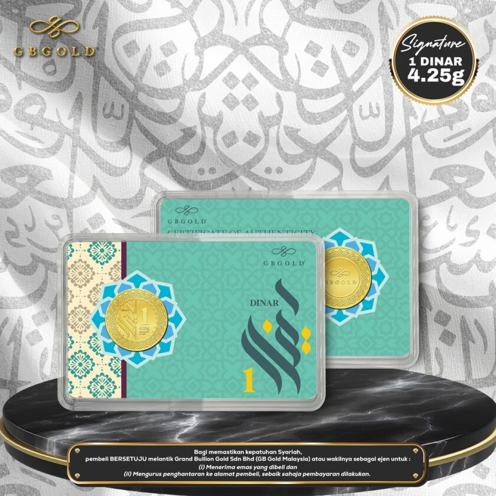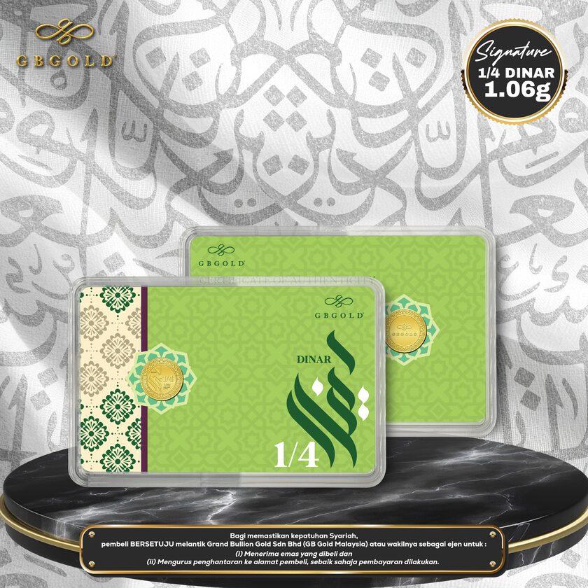 Introducing the GB GOLD Signature 1/4 Dinar 1.06g (Emas 999.9), the perfect addition to your collection of gold decorations and accessories. Crafted with 999.9/24K purity, this gold dinar is a must-have for any discerning collector.
