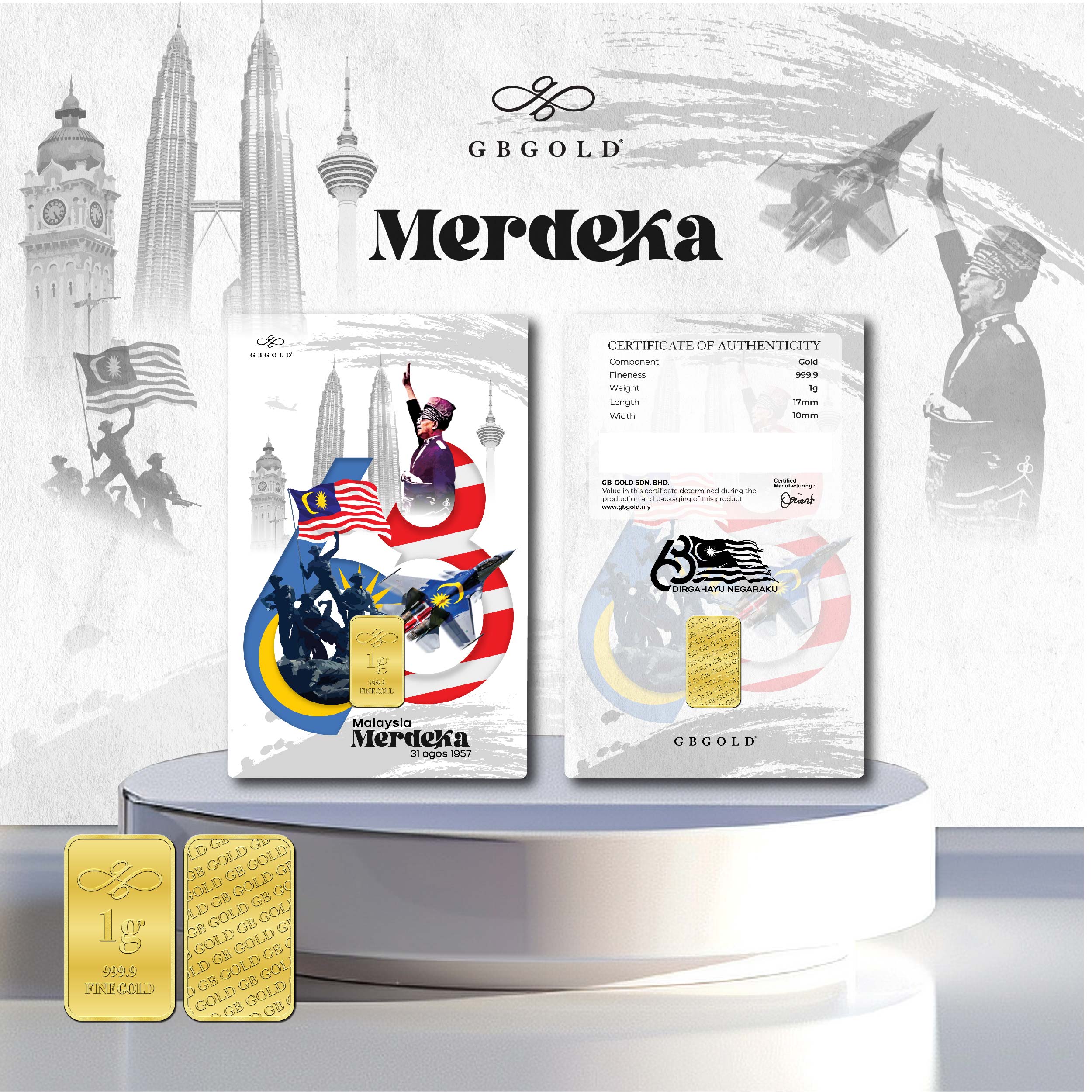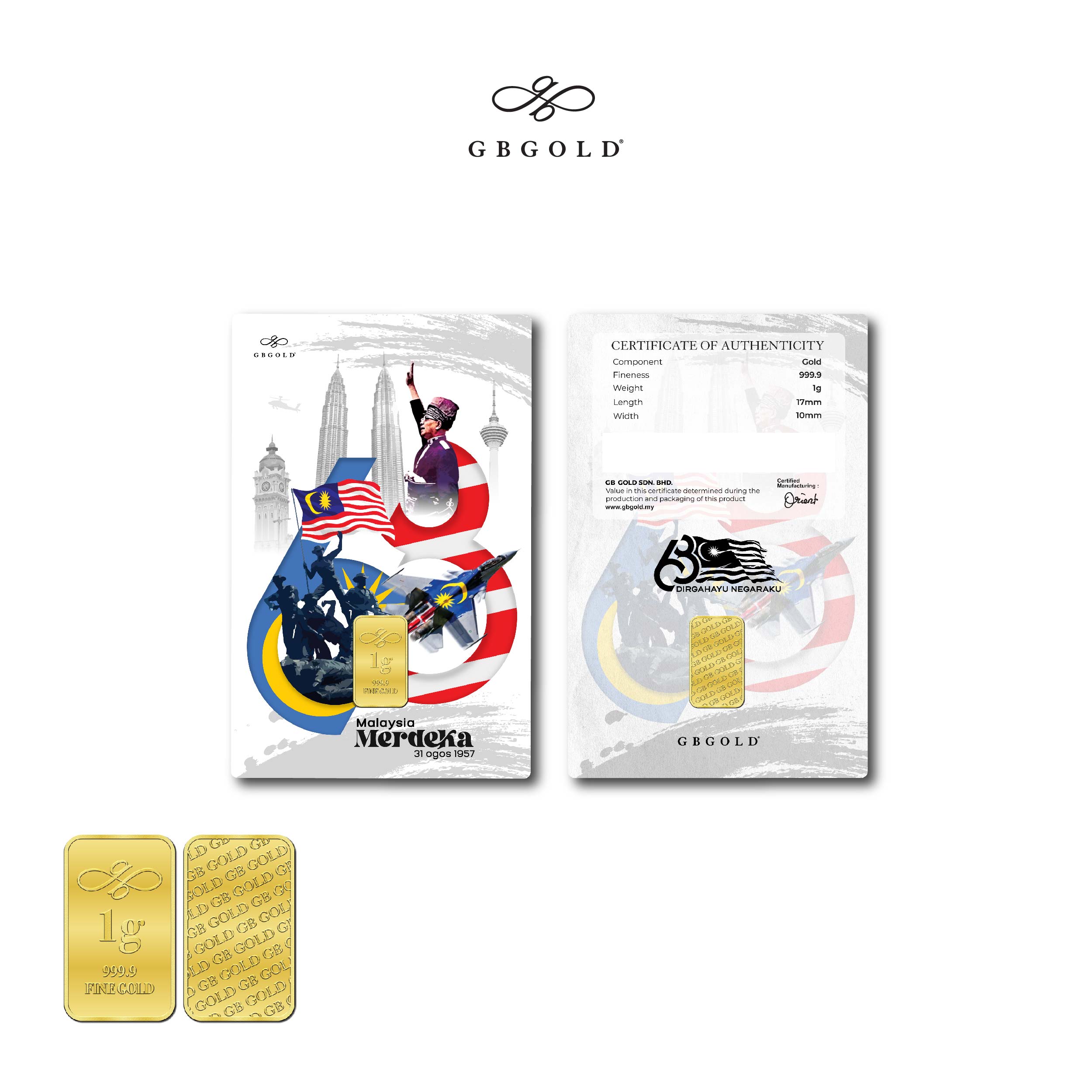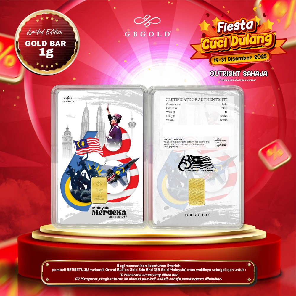 Introducing the GB Gold Merdeka Gold Bar 1g (Emas 999.9), the perfect addition to your collection of gold decorations and accessories. Crafted with 999.9/24K purity, this gold bullion bar is a must-have for any discerning collector.
