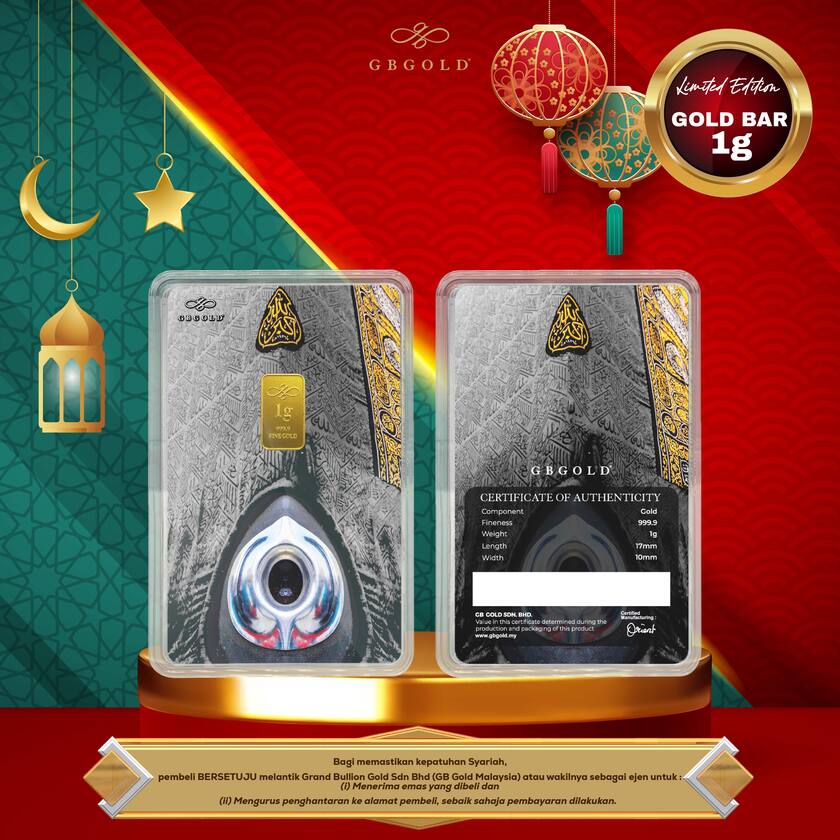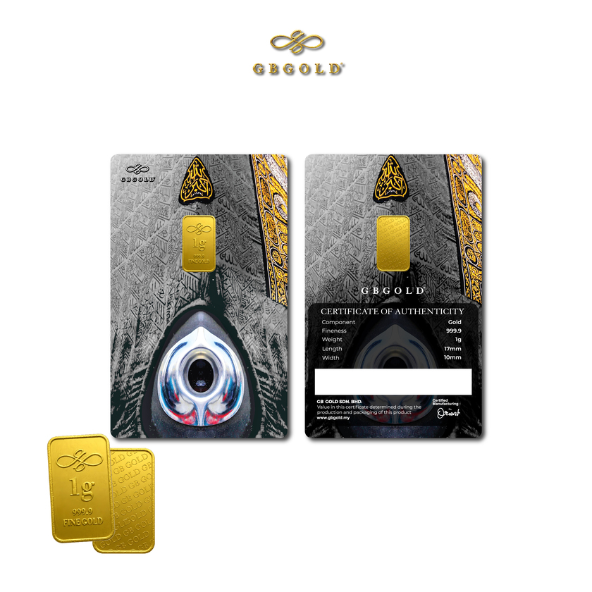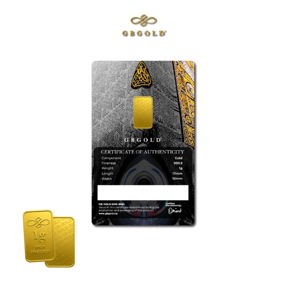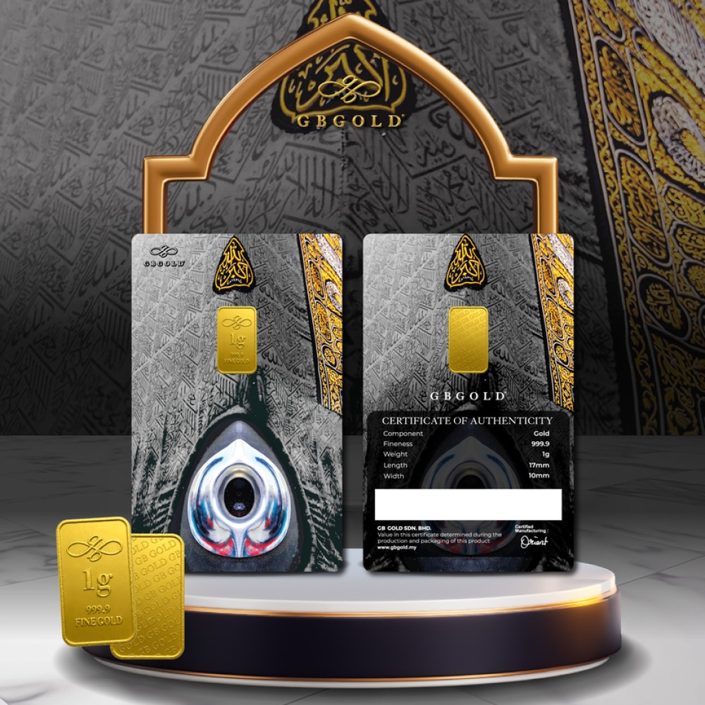 Introducing the GB GOLD Hajar Aswad Gold Bar 1g (Emas 999.9), the perfect addition to your collection of gold decorations and accessories. Crafted with 999.9/24K purity, this gold bullion bar is a must-have for any discerning collector.