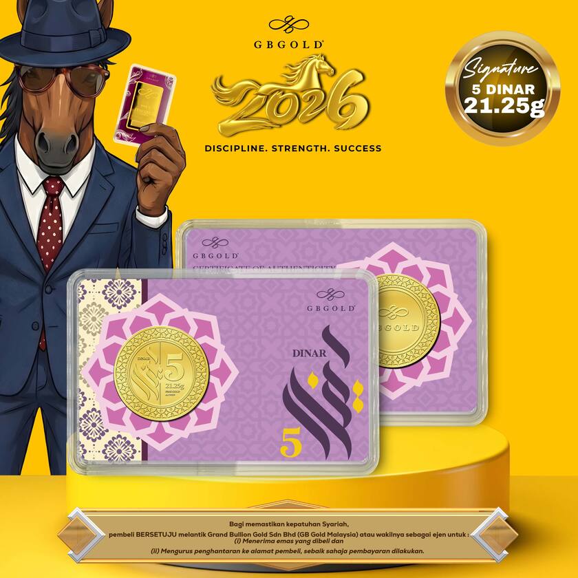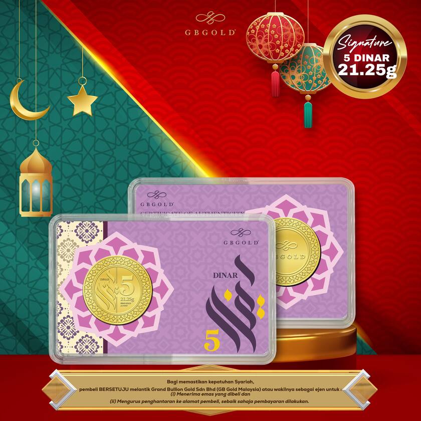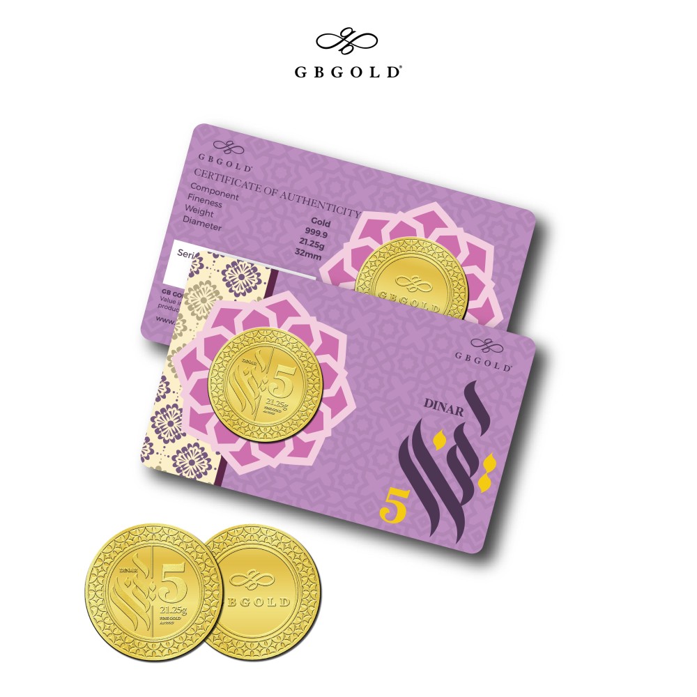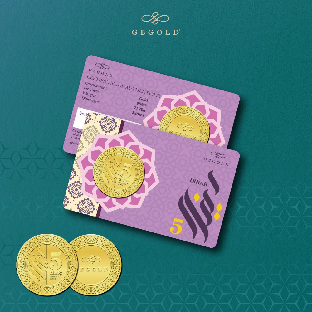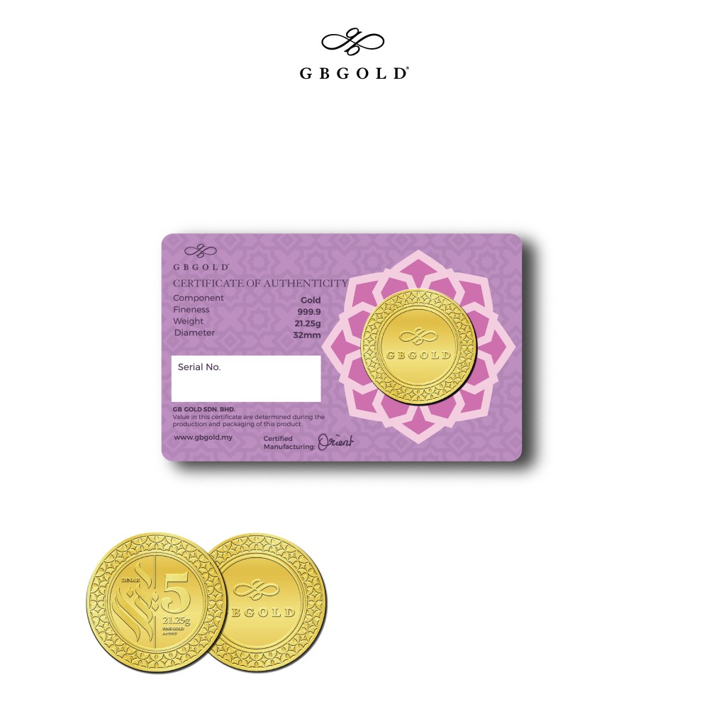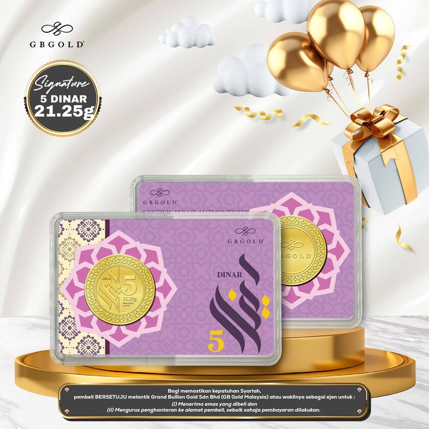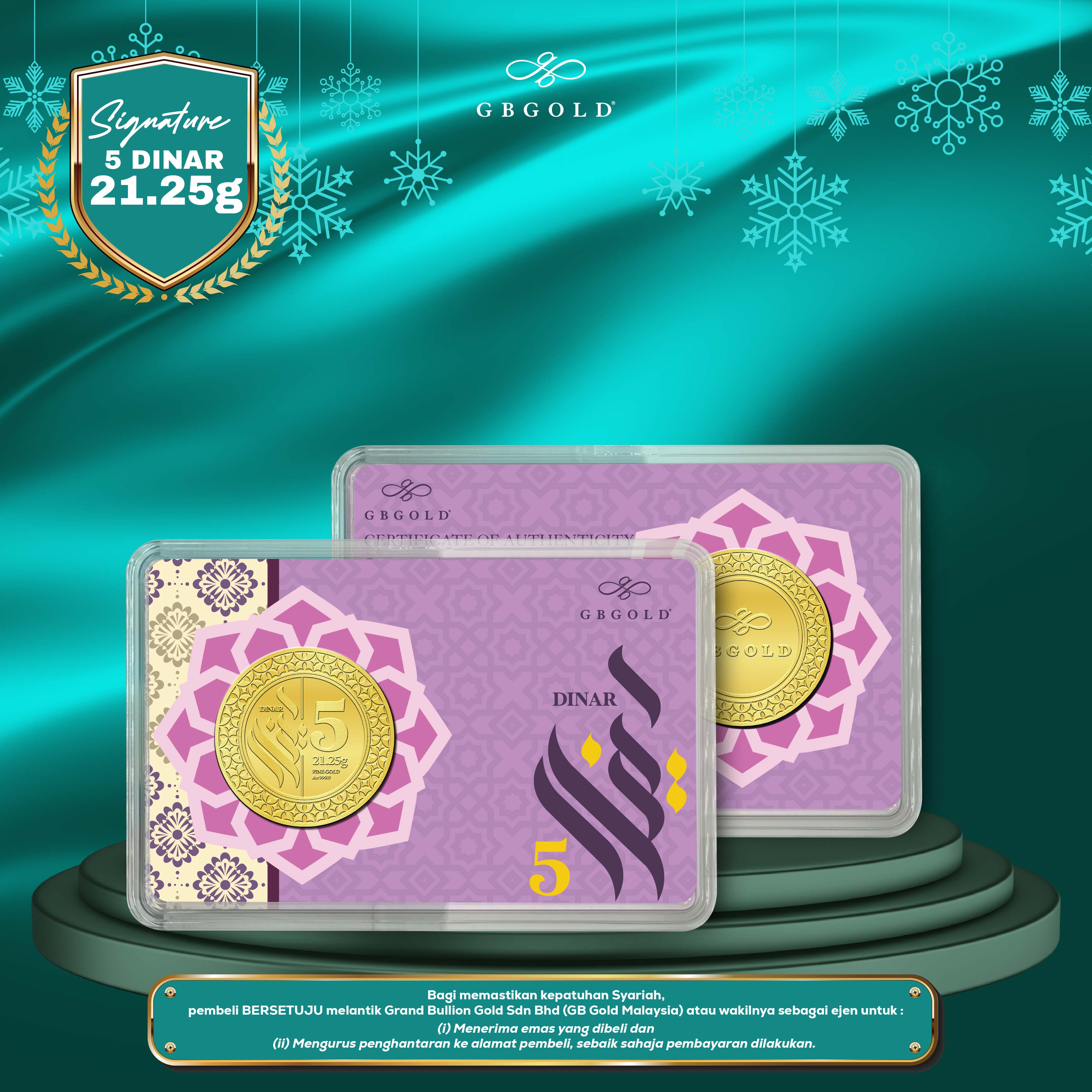 Introducing the GB GOLD Signature 5 Dinar 21.25g (Emas 999.9), the perfect addition to your collection of gold decorations and accessories. Crafted with 999.9/24K purity, this gold dinar is a must-have for any discerning collector.