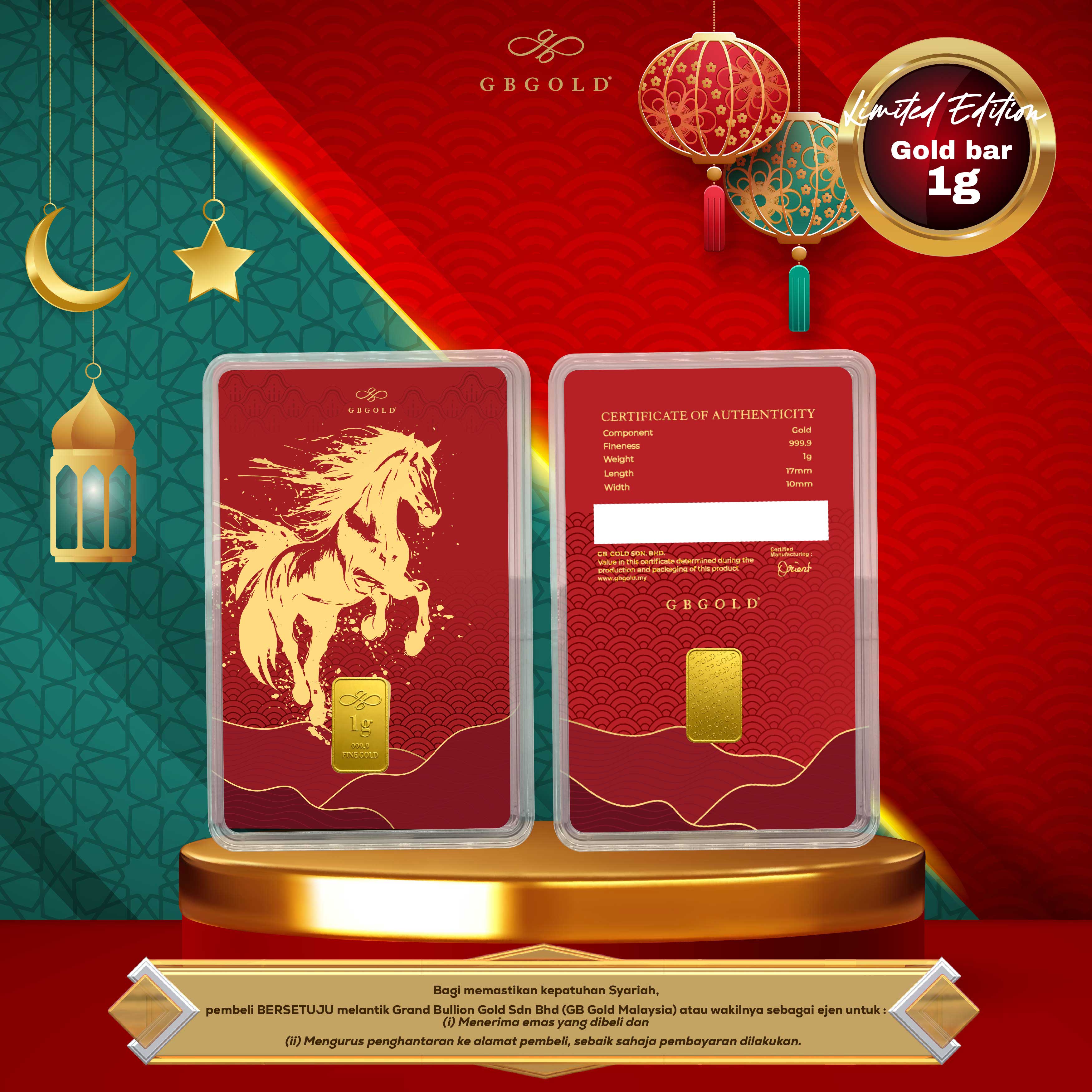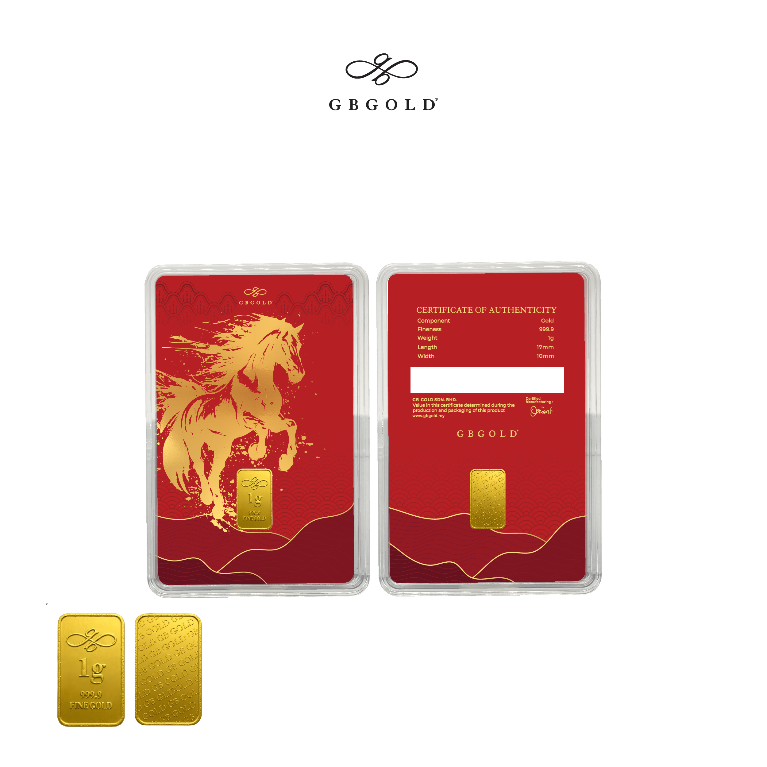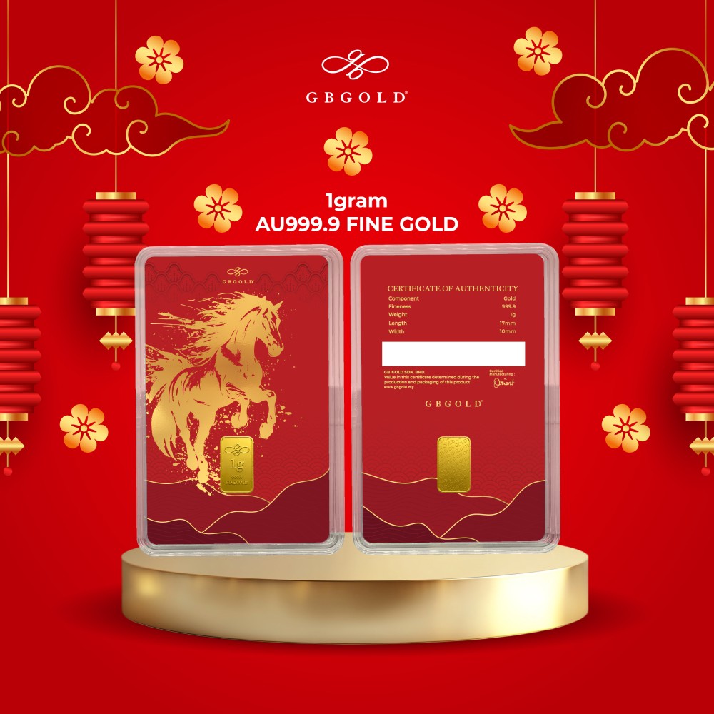 Introducing GB Gold Year Of The Horse 1g Gold Bar - 1g (Emas 999.9), the perfect addition to your collection of gold decorations and accessories. Crafted with 999.9/24K purity, this gold bullion bar is a must-have for any discerning collector.