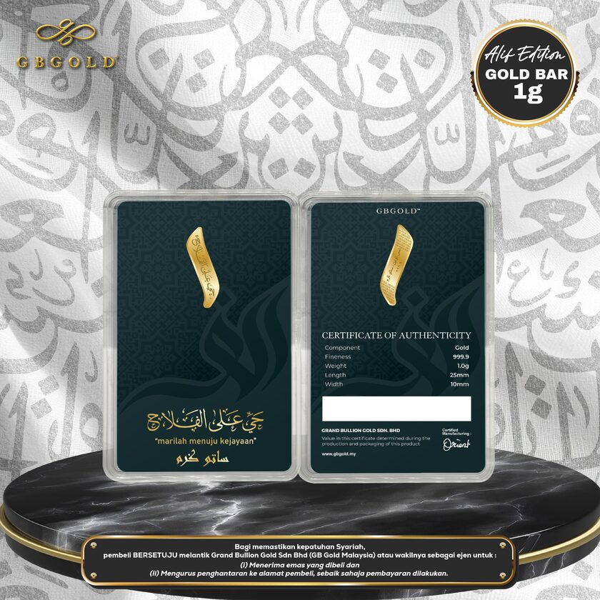 Introducing the GB GOLD ALIF Gold Bar 1g (Emas 999.9), the perfect addition to your collection of gold decorations and accessories. Crafted with 999.9/24K purity, this gold bullion bar is a must-have for any discerning collector.