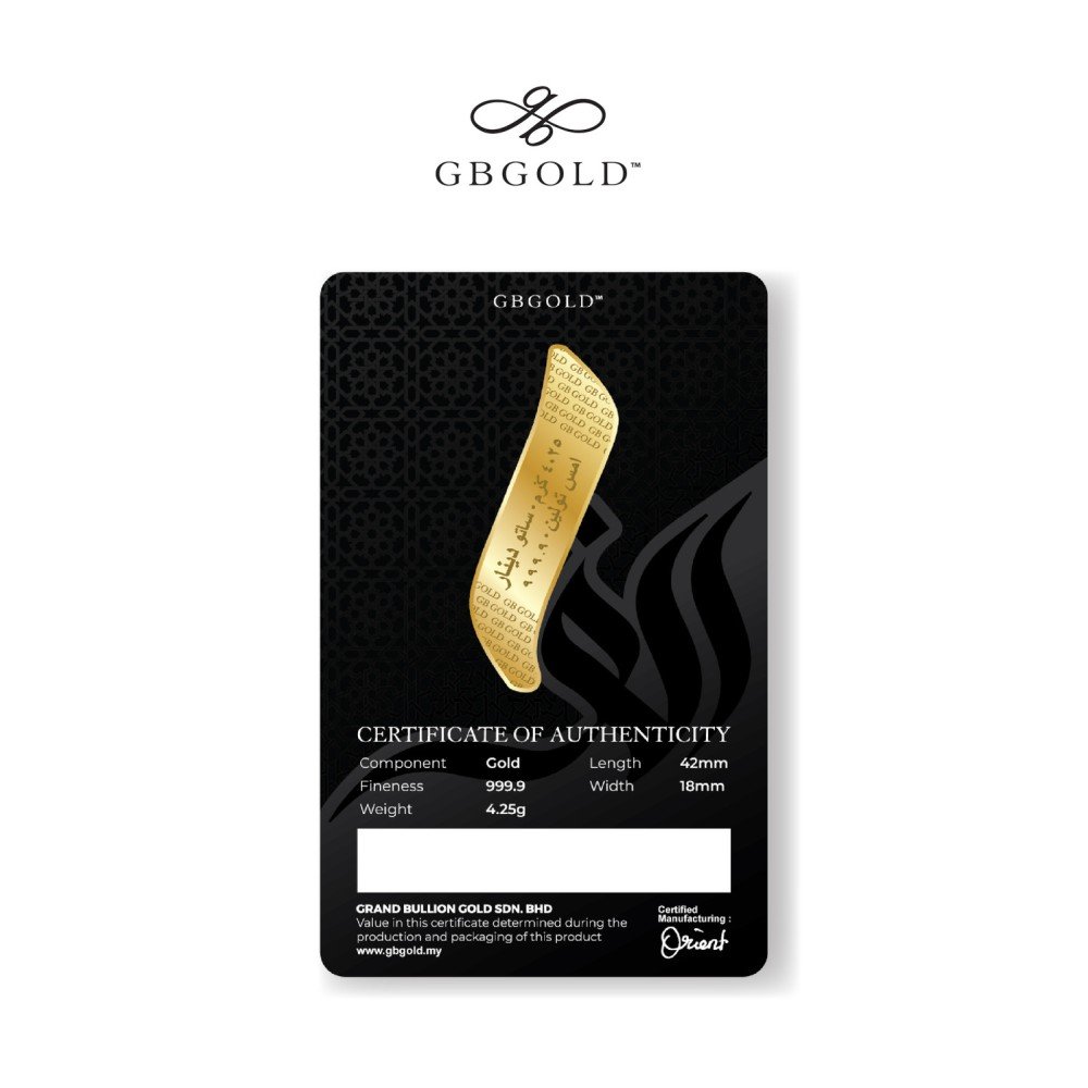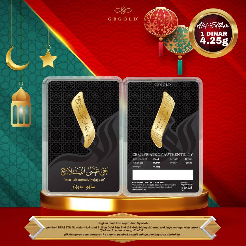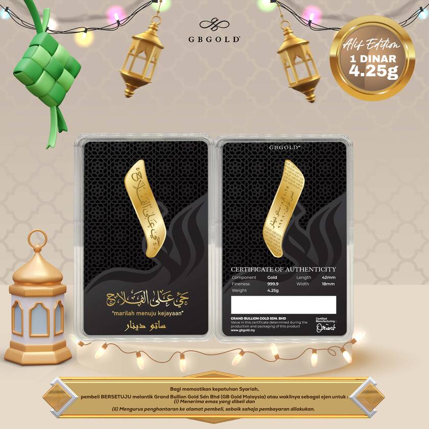 Introducing the GB GOLD ALIF 1 Dinar 4.25gm (Emas 999.9), the perfect addition to your collection of gold decorations and accessories. Crafted with 999.9/24K purity, this gold dinar is a must-have for any discerning collector.