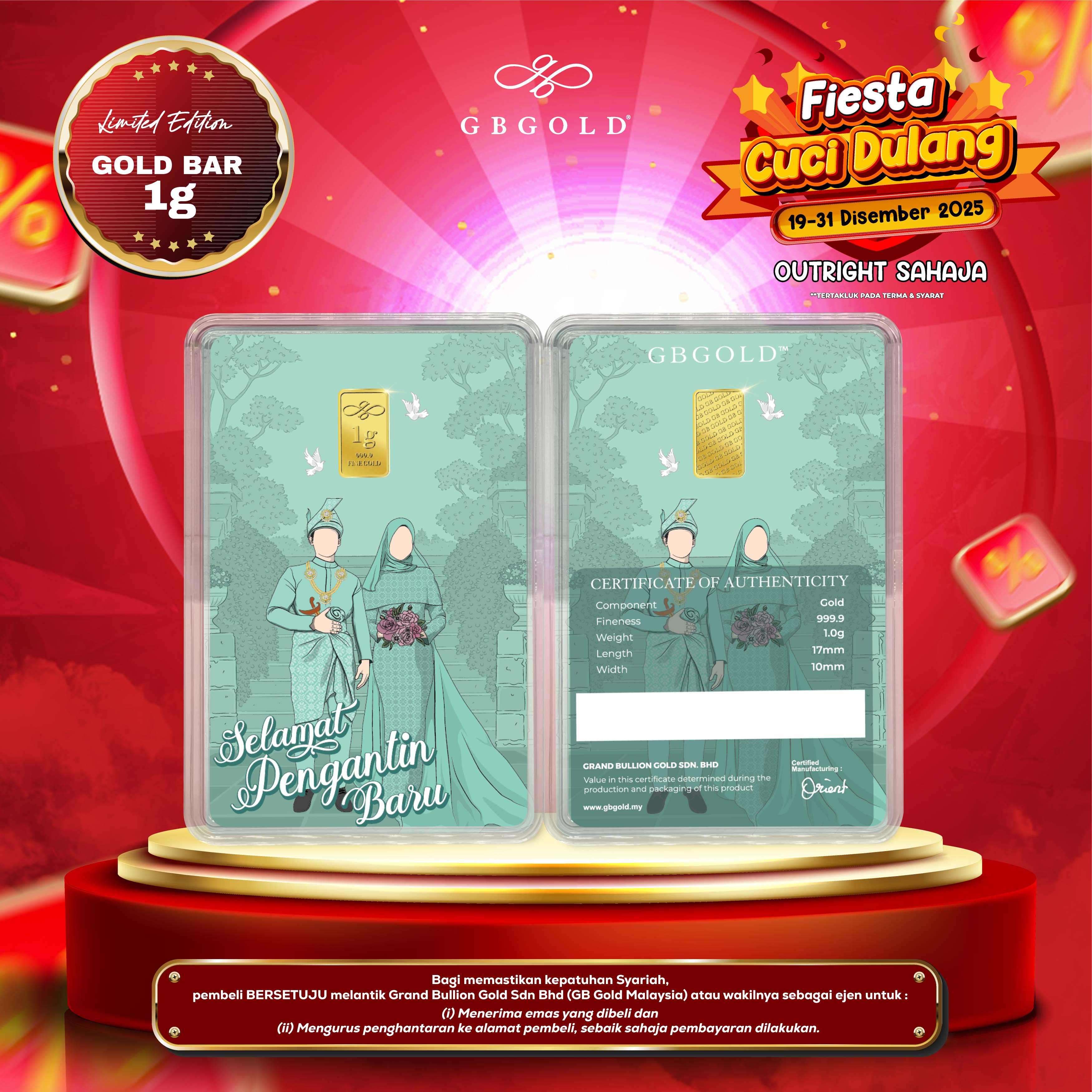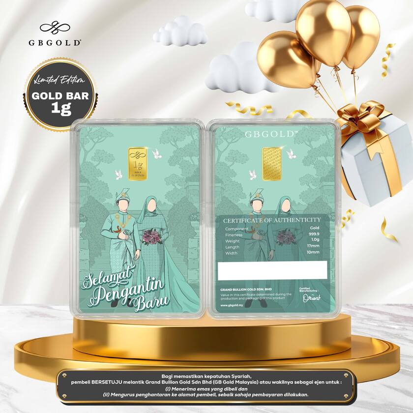 Introducing the GB GOLD Selamat Pengantin Baru Green Mint Gold Bar 1g (Emas 999.9), the perfect addition to your collection of gold decorations and accessories. Crafted with 999.9/24K purity, this gold bullion bar is a must-have for any discerning collector.