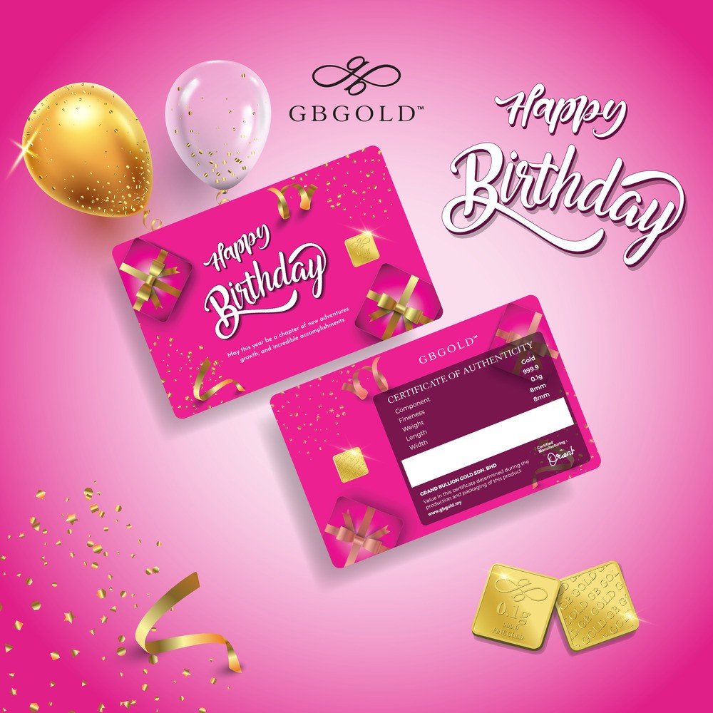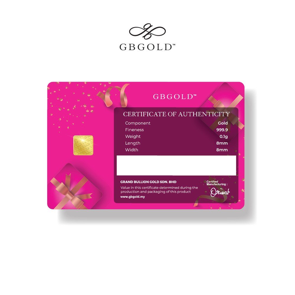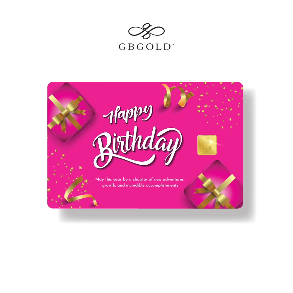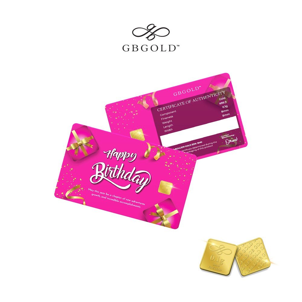Introducing the GB GOLD Birthday Pink Gold Bar 0.1g (Emas 999.9), the perfect addition to your collection of gold decorations and accessories. Crafted with 999.9/24K purity, this gold bullion bar is a must-have for any discerning collector.