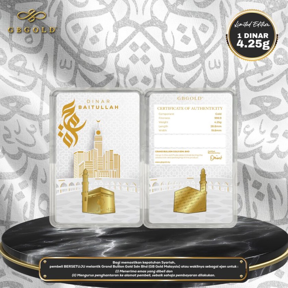 Introducing the GB GOLD BAITULLAH 1 Dinar 4.25gm (Emas 999.9), the perfect addition to your collection of gold decorations and accessories. Crafted with 999.9/24K purity, this gold dinar is a must-have for any discerning collector.