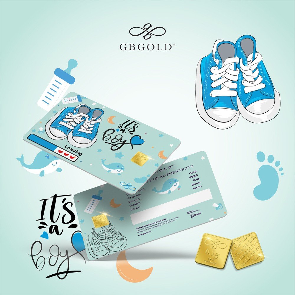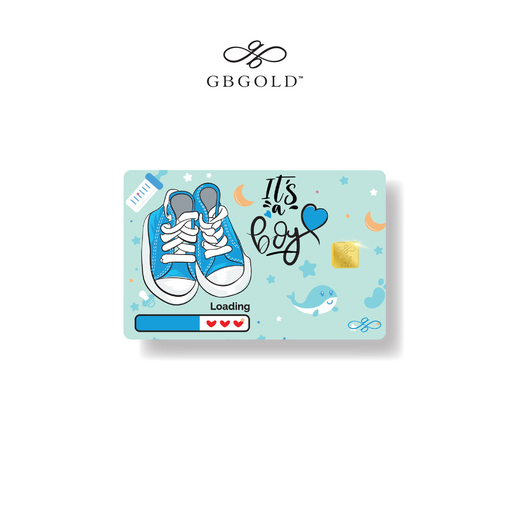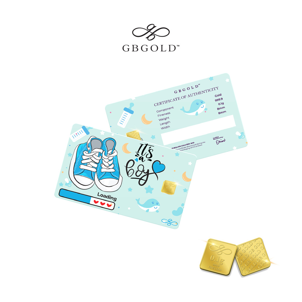 Introducing the GB Gold It's A Boy Gold Bar - 0.10g (Emas 999.9), the perfect addition to your collection of gold decorations and accessories. Crafted with 999.9/24K purity, this gold bullion bar is a must-have for any discerning collector.
