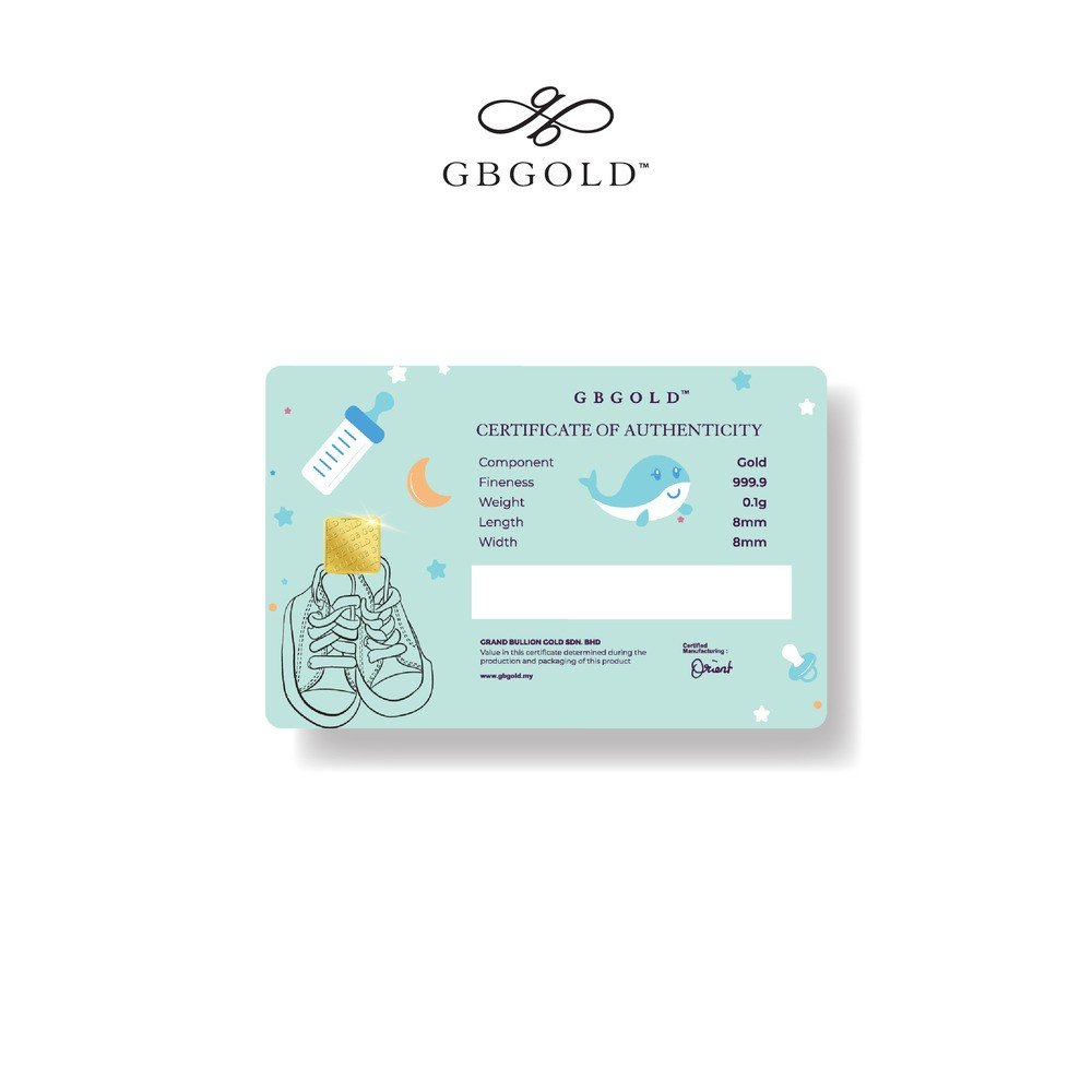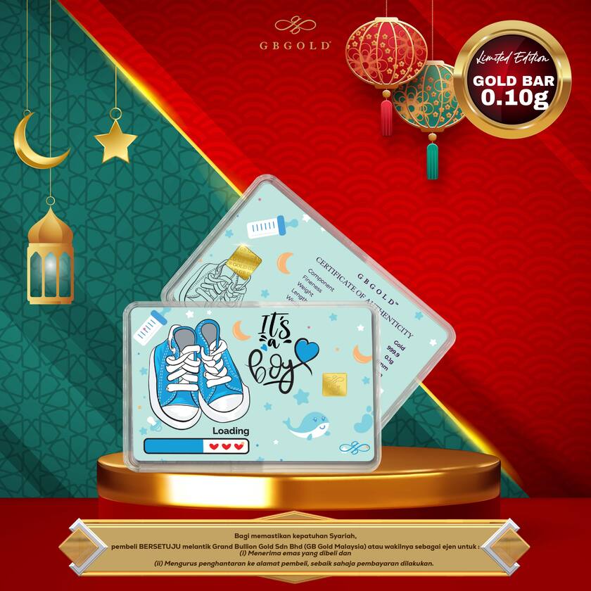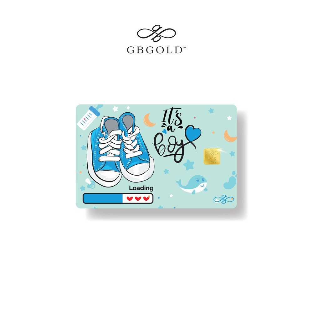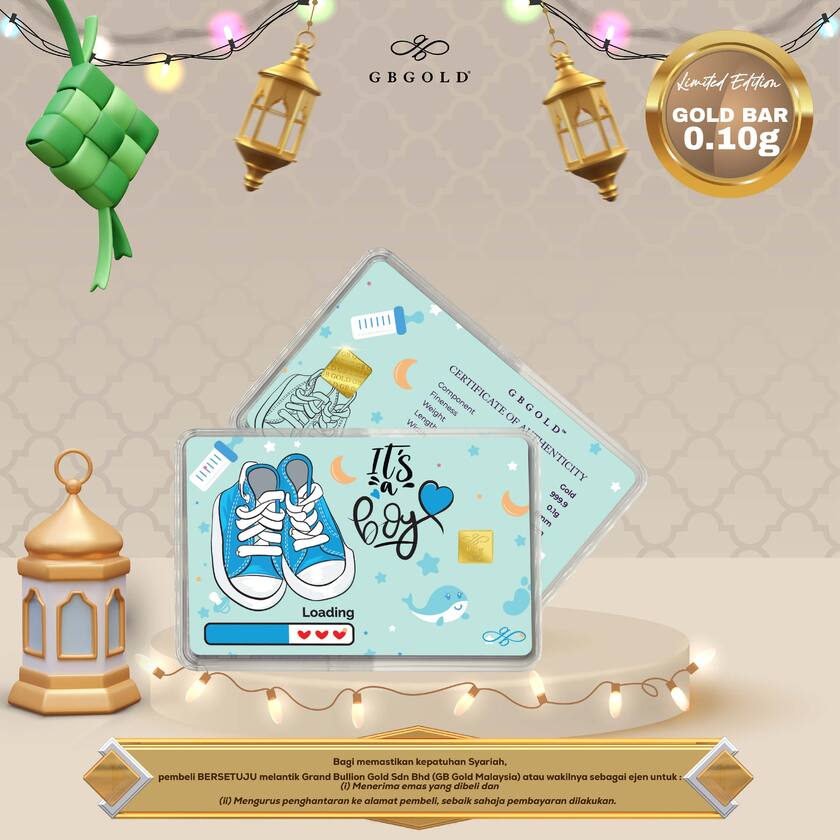 Introducing the GB Gold It's A Boy Gold Bar - 0.10g (Emas 999.9), the perfect addition to your collection of gold decorations and accessories. Crafted with 999.9/24K purity, this gold bullion bar is a must-have for any discerning collector.