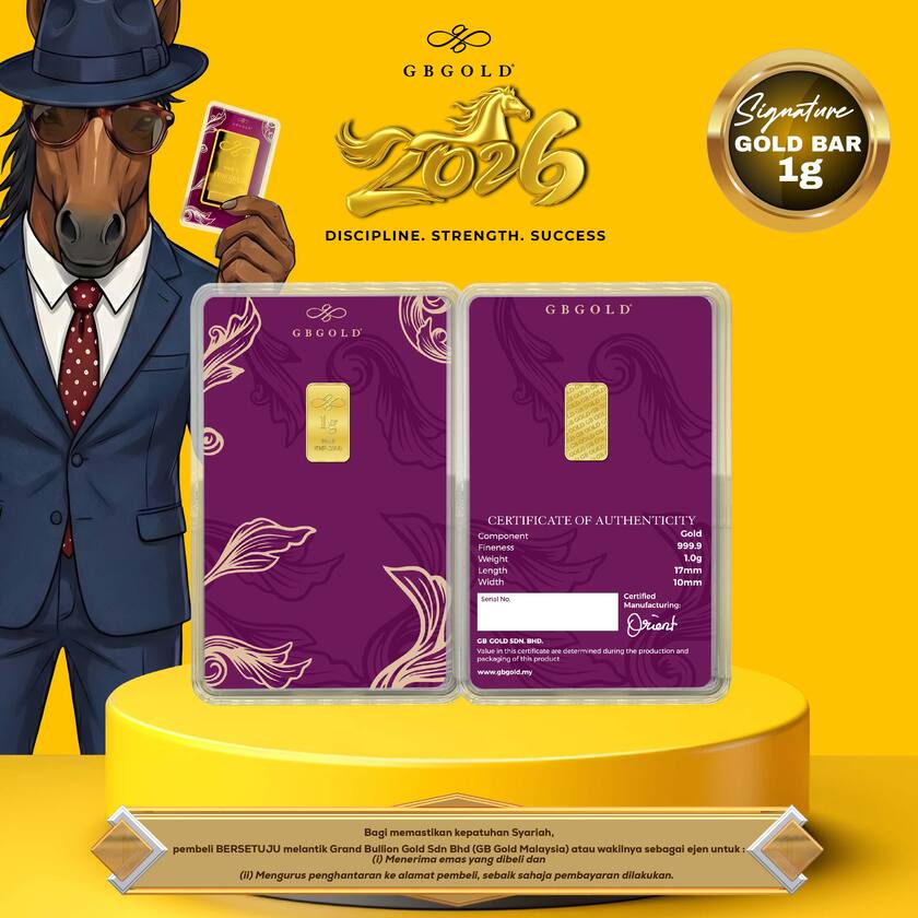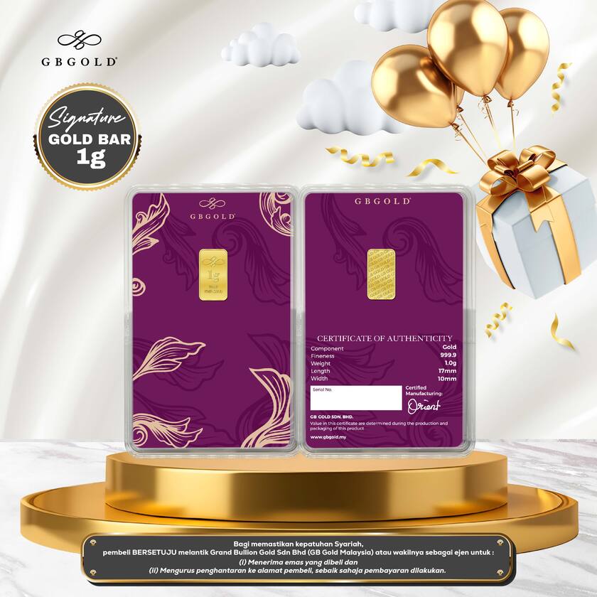 Introducing the GB GOLD Signature Gold Bar 1g (Emas 999.9), the perfect addition to your collection of gold decorations and accessories. Crafted with 999.9/24K purity, this gold bullion bar is a must-have for any discerning collector.
