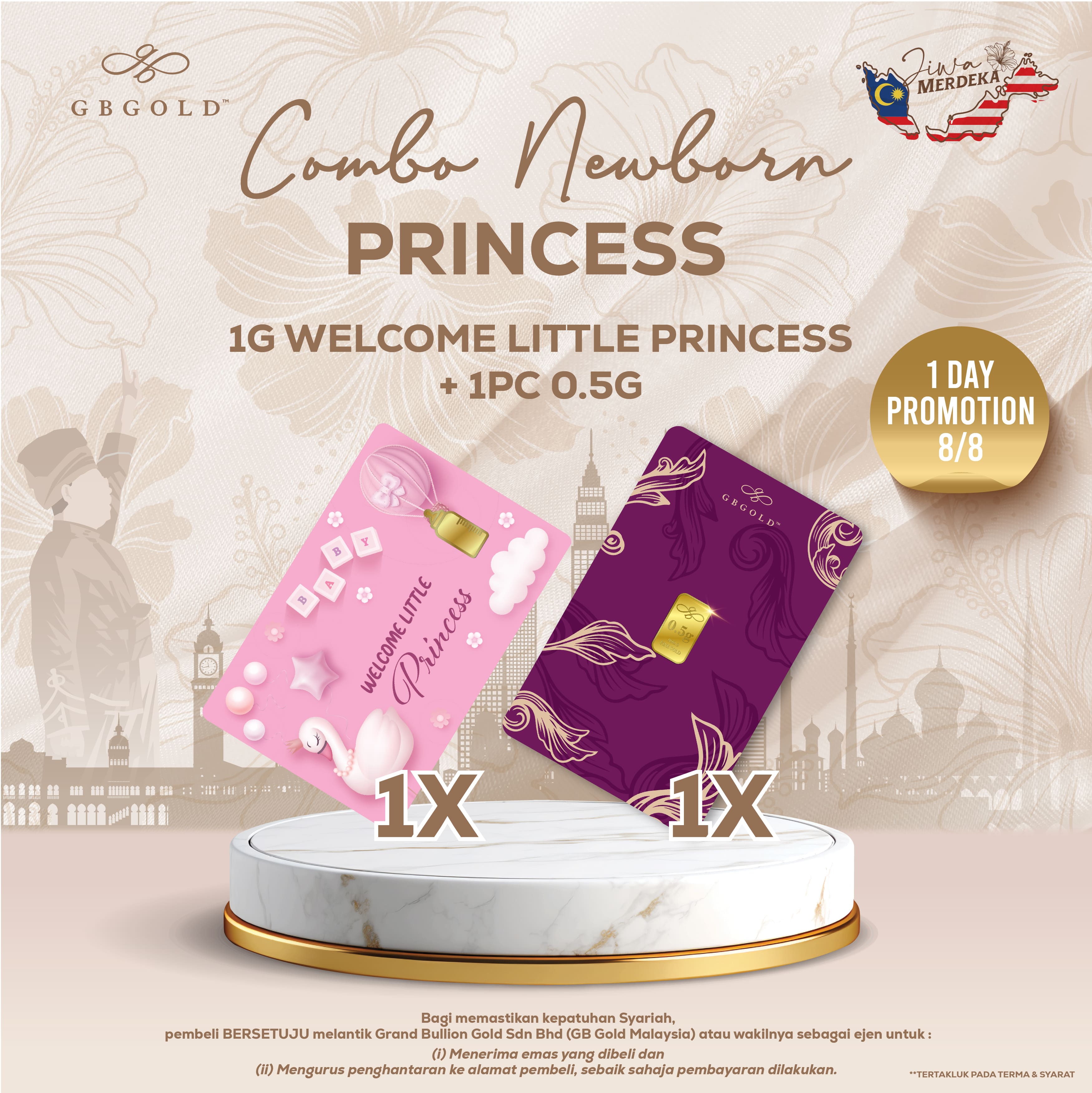 Introducing the GB Gold Welcome Princess Blue Bottle Gold Bar 1g plus with GB GOLD Signature Gold Bar 0.5g (Emas 999.9), the perfect addition to your collection of gold decorations and accessories. Crafted with 999.9/24K purity, this gold bullion bar is a must-have for any discerning collector.