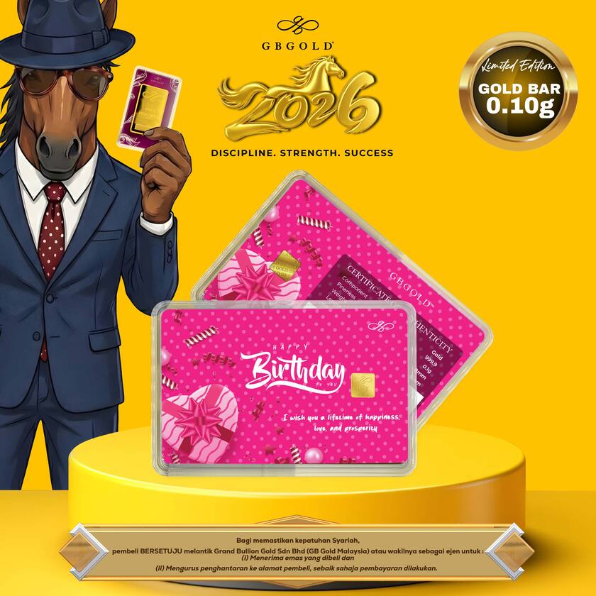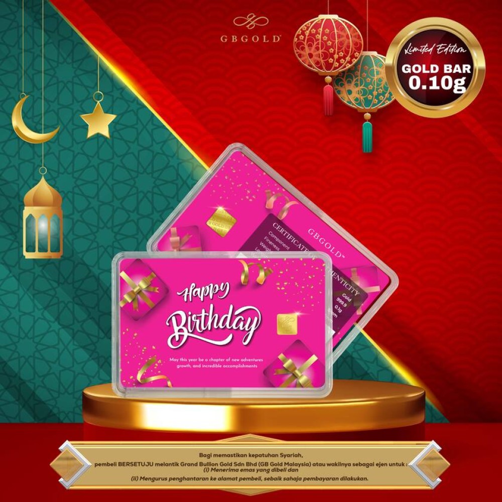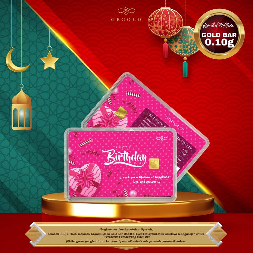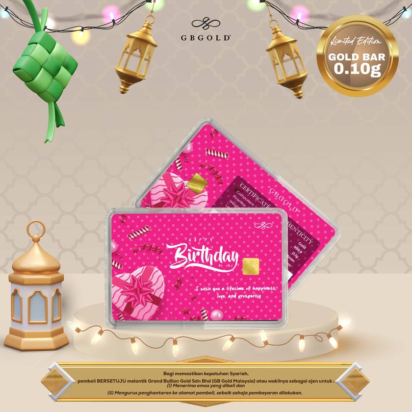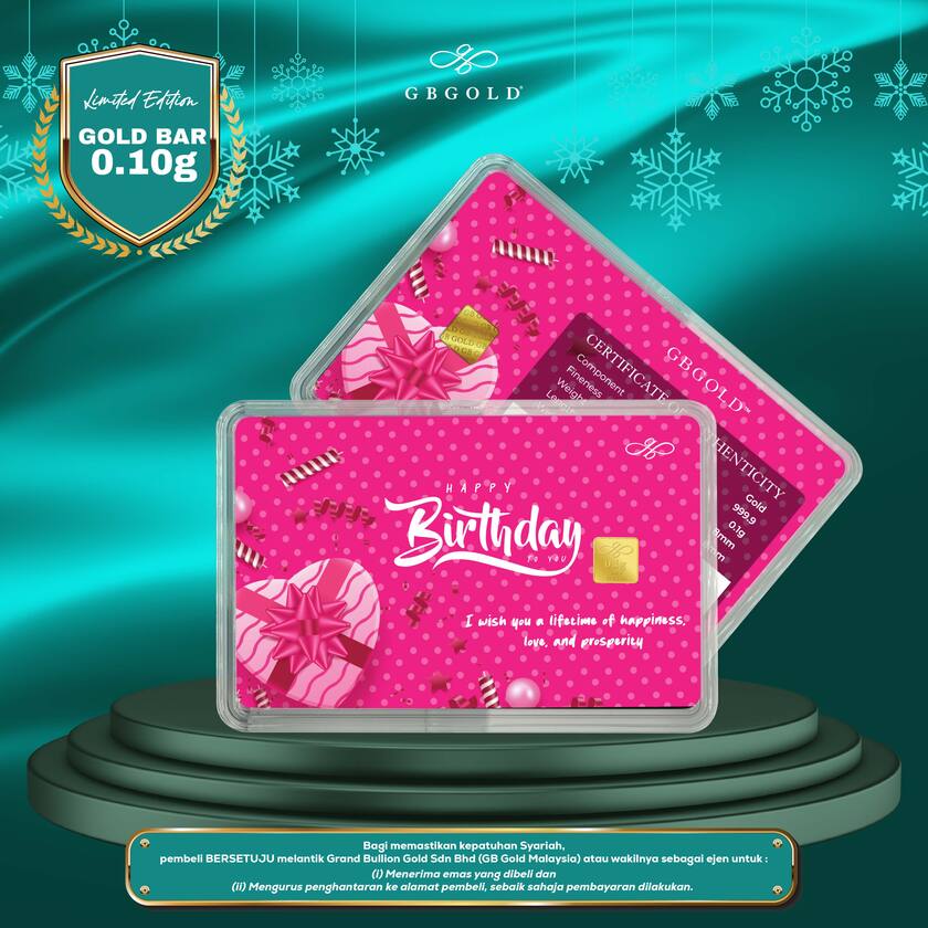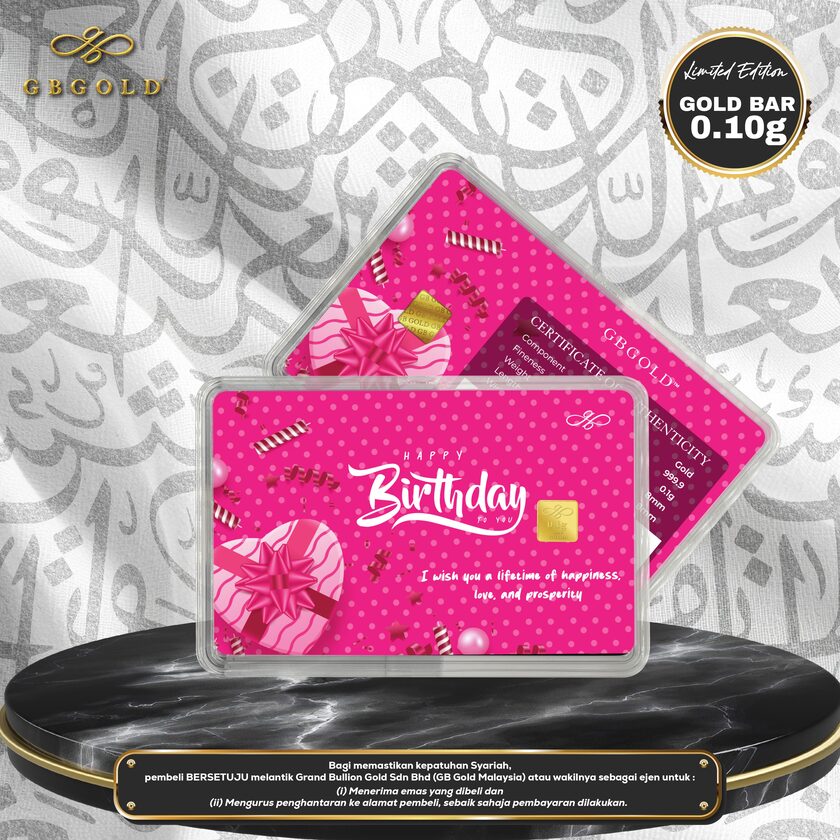 Introducing the GB GOLD Happy Birthday Bubble Pink Gold Bar 0.1g (Emas 999.9), the perfect addition to your collection of gold decorations and accessories. Crafted with 999.9/24K purity, this gold bullion bar is a must-have for any discerning collector.
