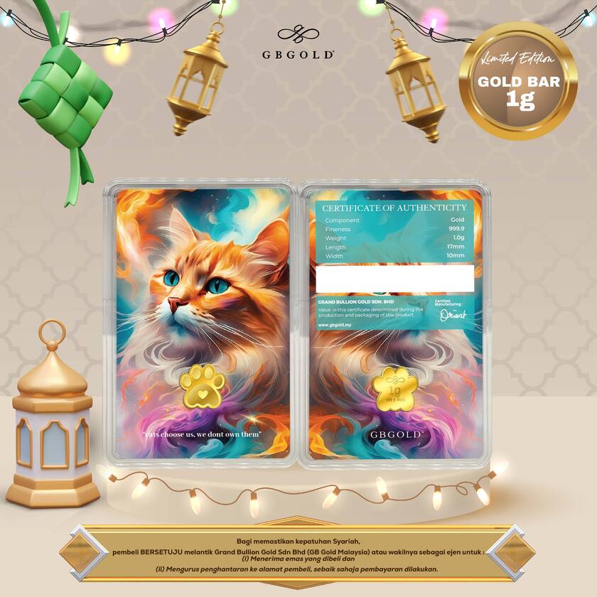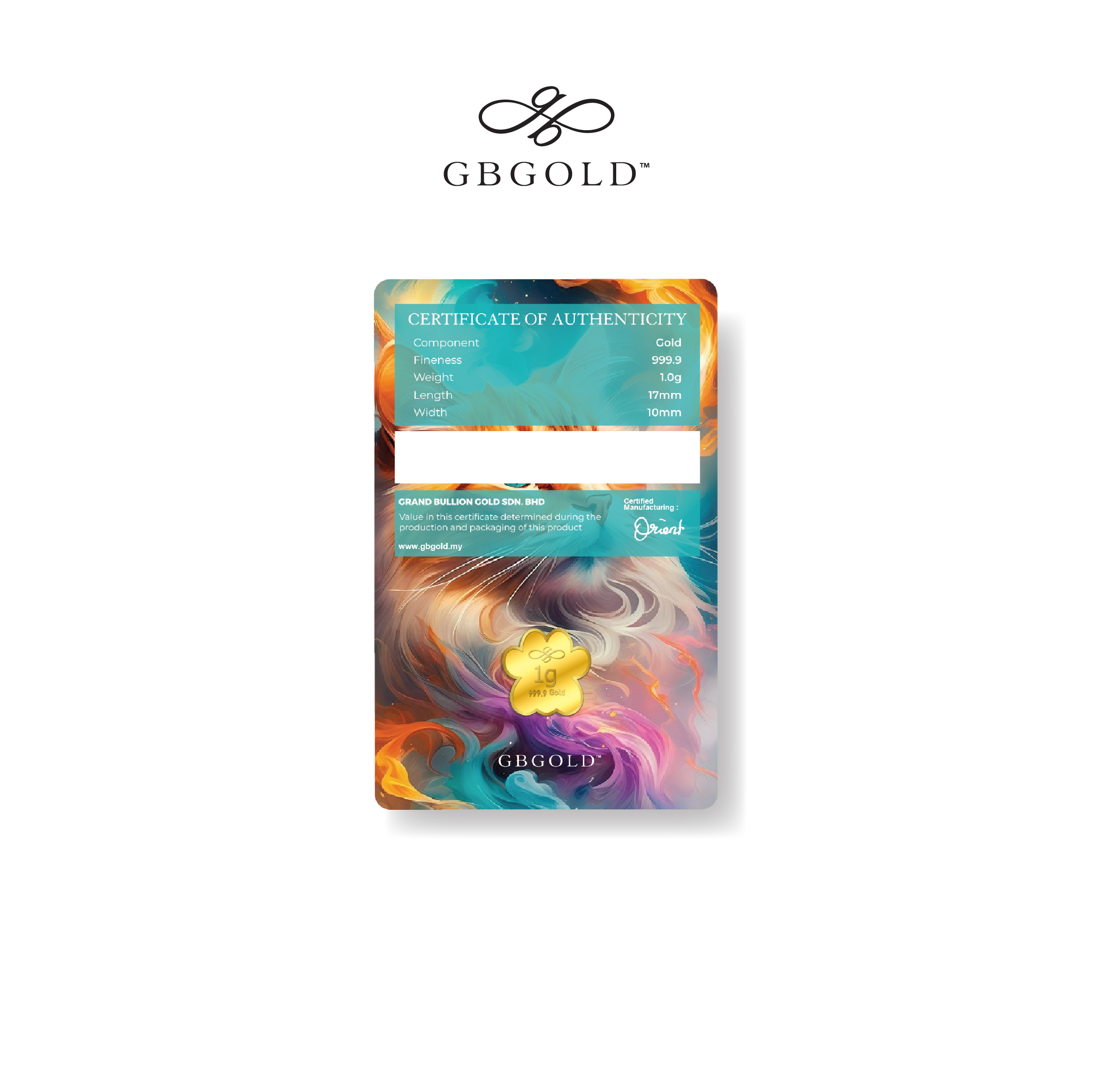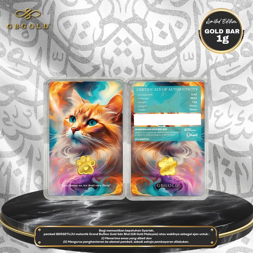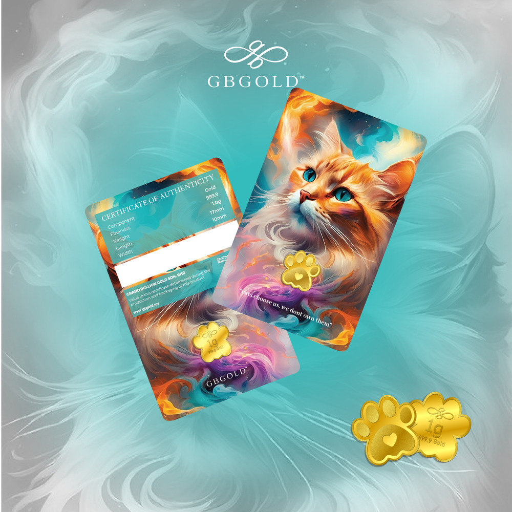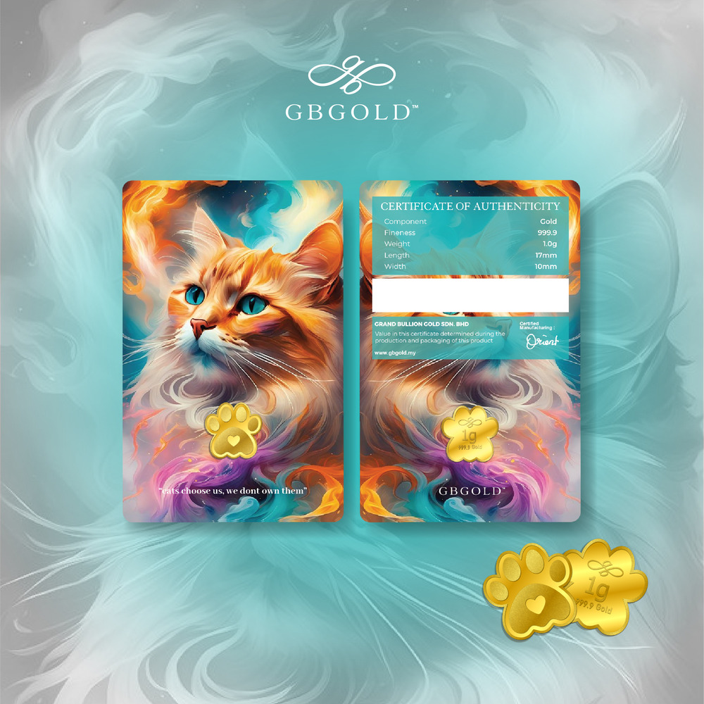 Introducing the GB Gold Cat Colourful Gold Bar - 1g (Emas 999.9), the perfect addition to your collection of gold decorations and accessories. Crafted with 999.9/24K purity, this gold bullion bar is a must-have for any discerning collector.