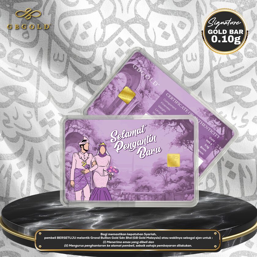 Introducing the GB GOLD Selamat Pengantin Baru(Purple) Gold Bar 0.1g (Emas 999.9), the perfect addition to your collection of gold decorations and accessories. Crafted with 999.9/24K purity, this gold bullion bar is a must-have for any discerning collector.