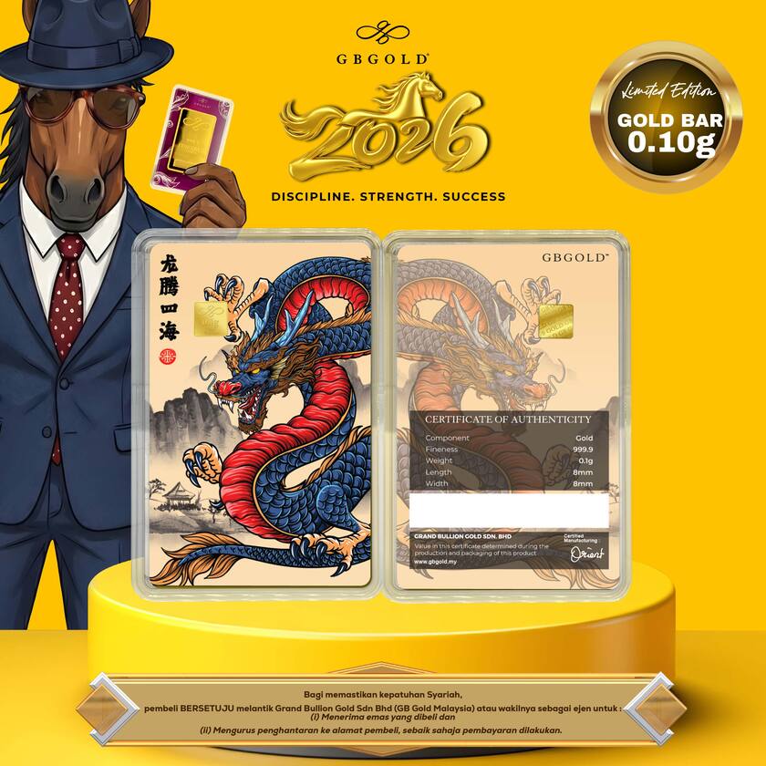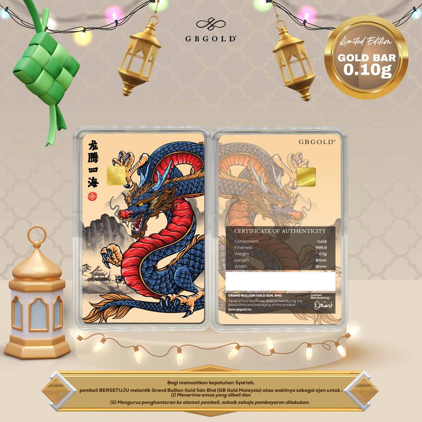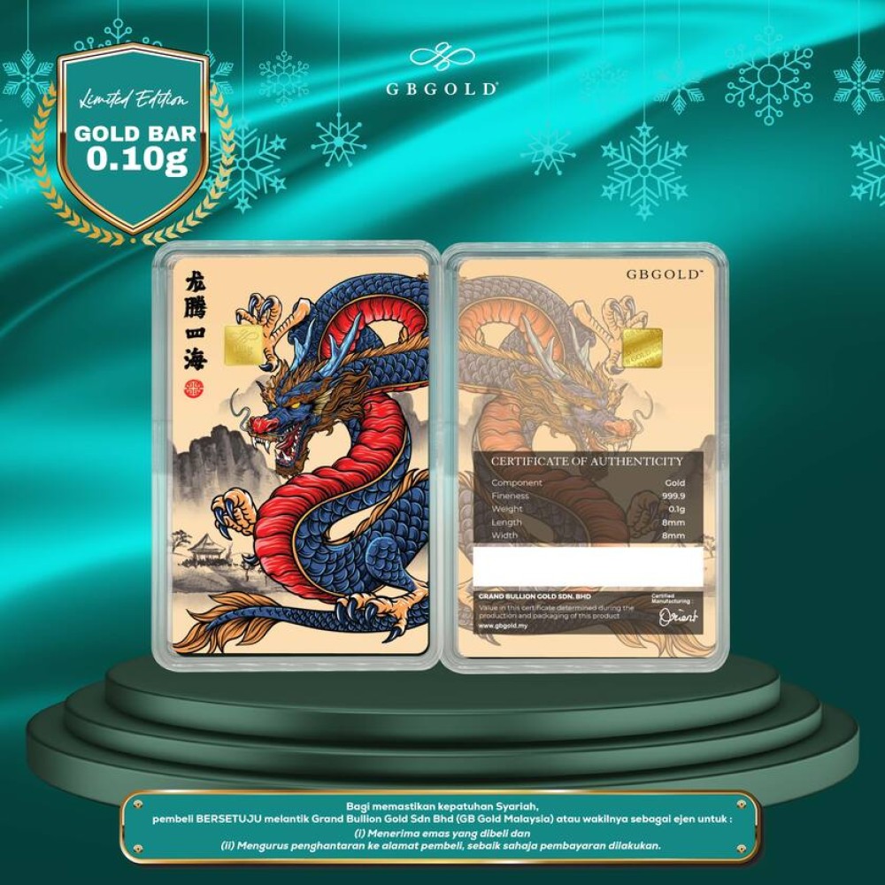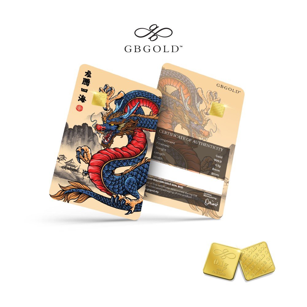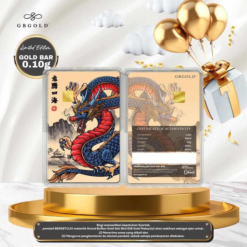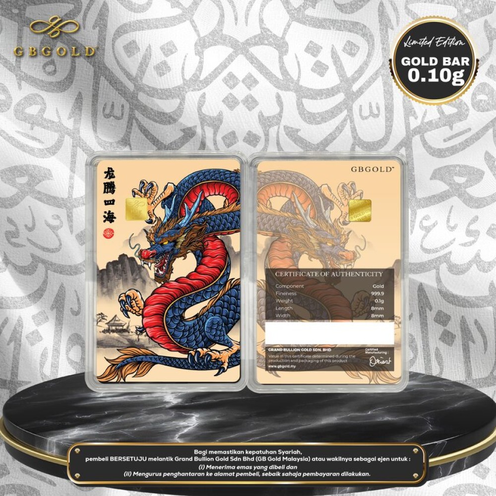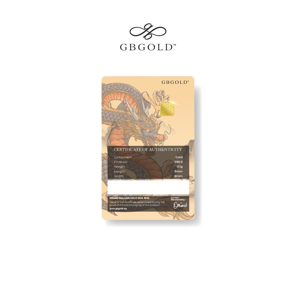 Introducing the GB Gold Dragon Blue Gold Bar - 0.10g (Emas 999.9), the perfect addition to your collection of gold decorations and accessories. Crafted with 999.9/24K purity, this gold bullion bar is a must-have for any discerning collector.
