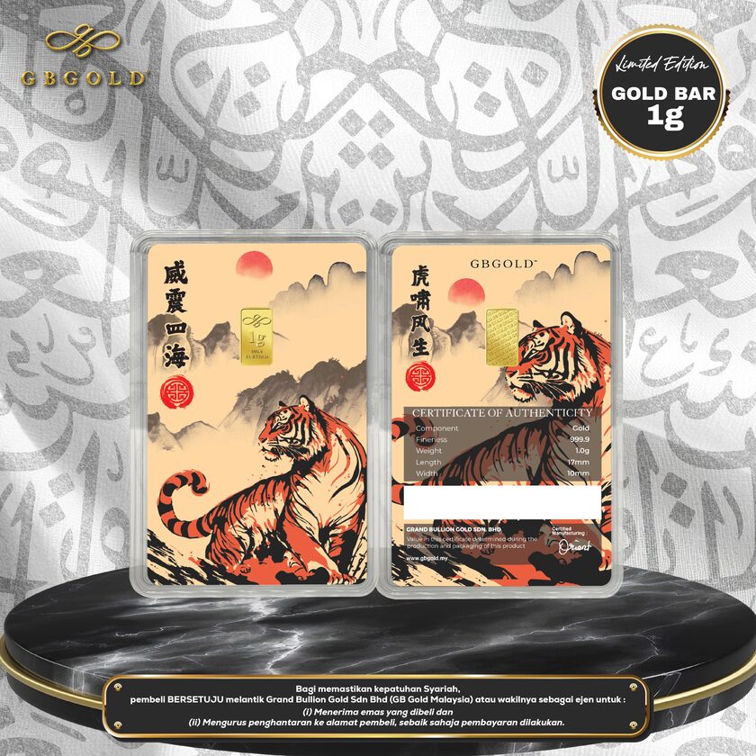 Introducing the GB Gold Tiger Painting Gold Bar 1g (Emas 999.9), the perfect addition to your collection of gold decorations and accessories. Crafted with 999.9/24K purity, this gold bullion bar is a must-have for any discerning collector.