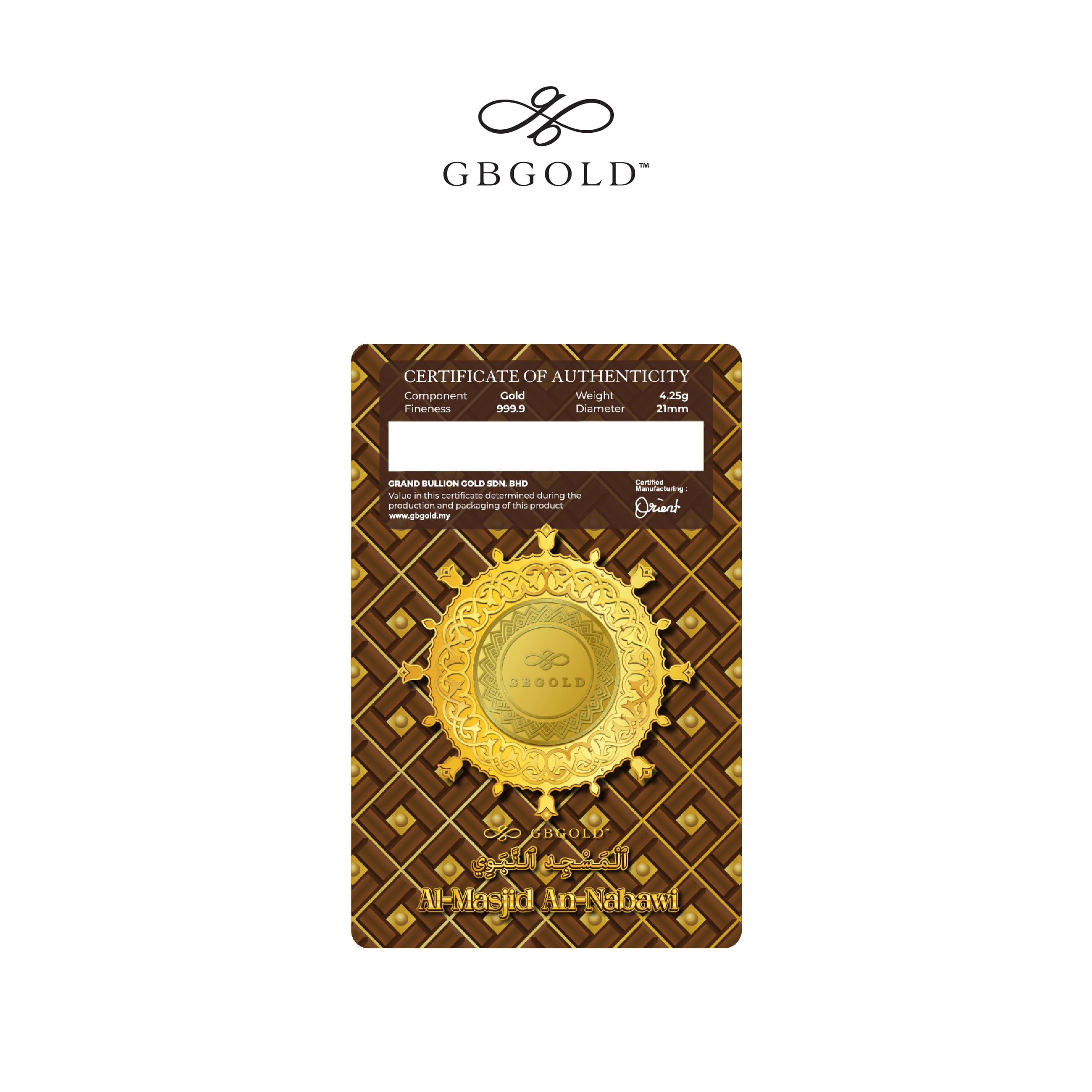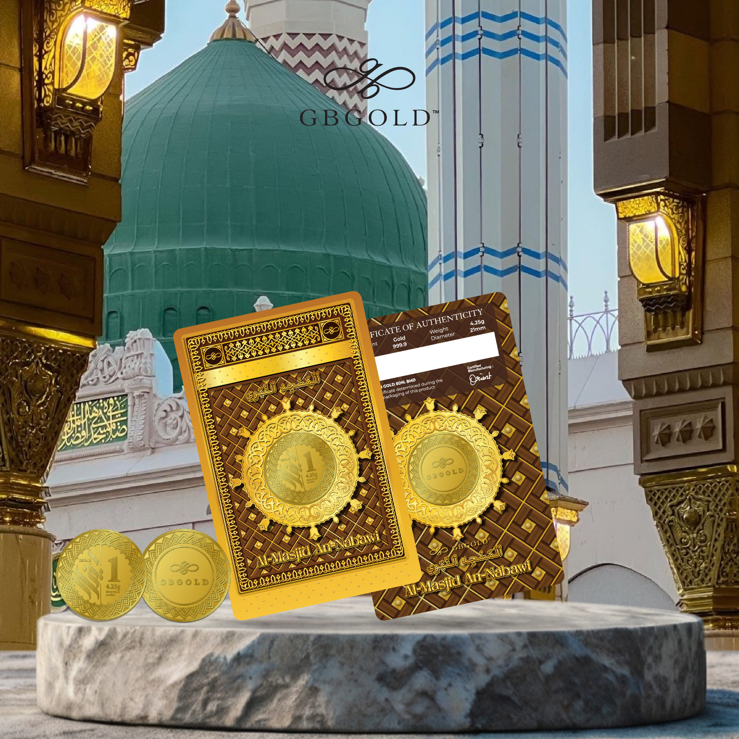 The GB GOLD An Nabawi 1 Dinar is an elegant addition to any display case.