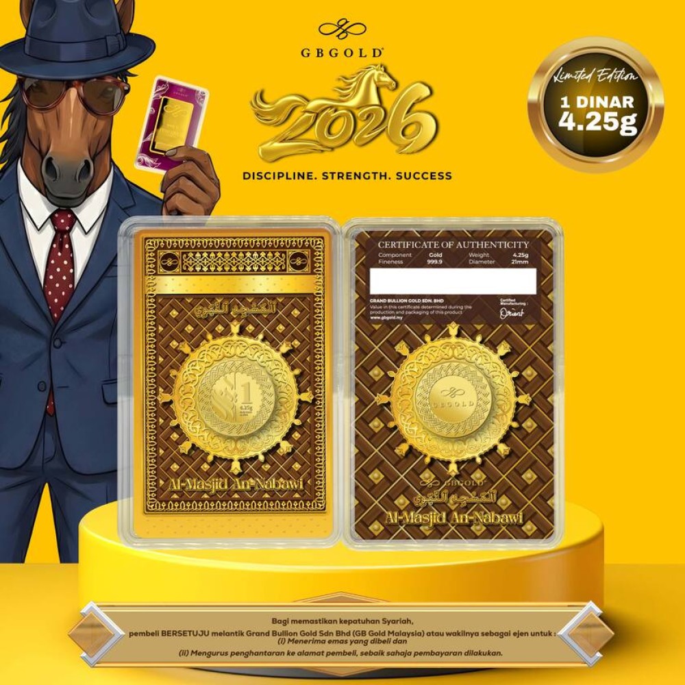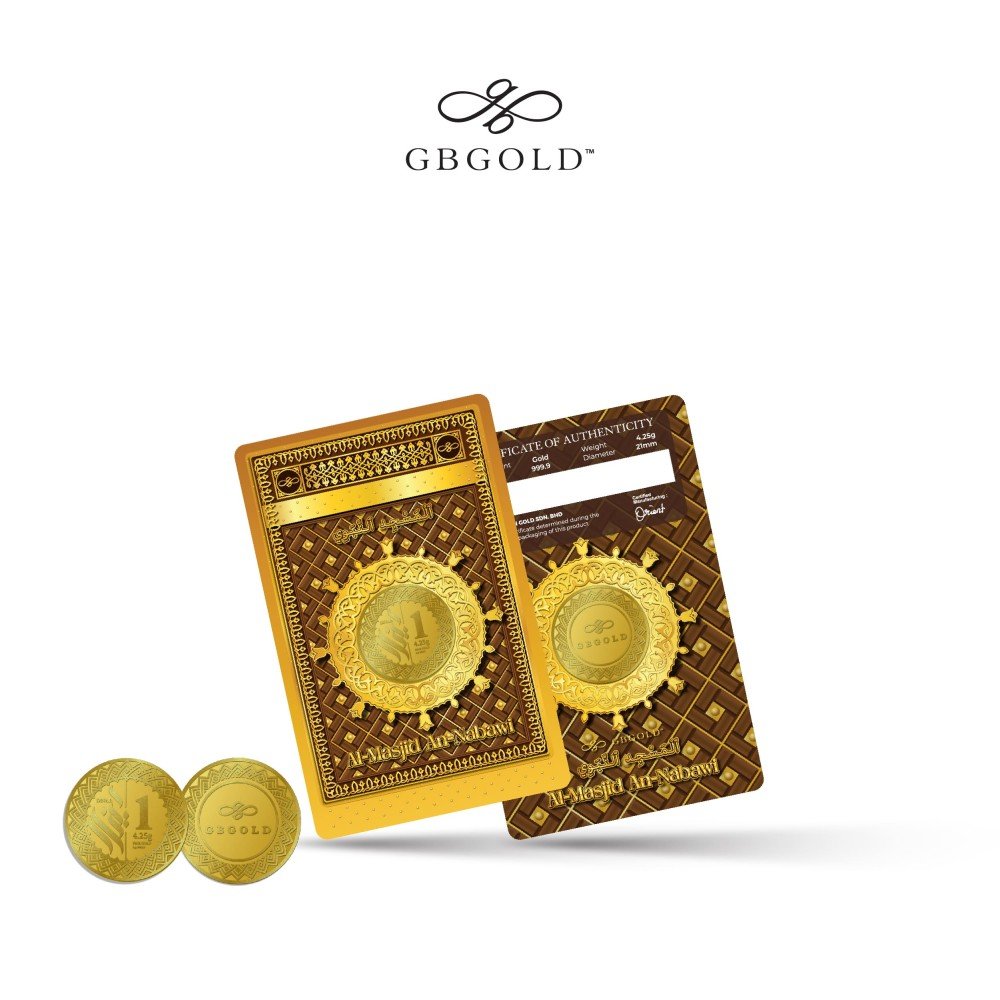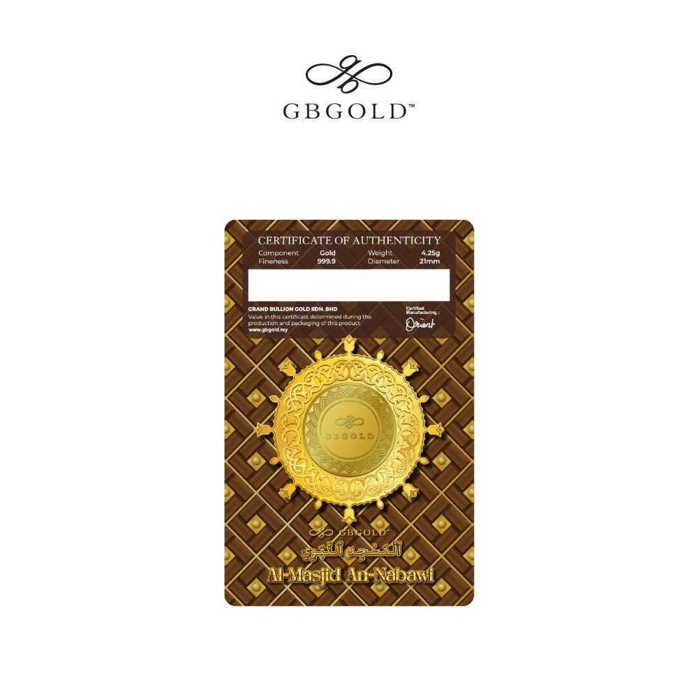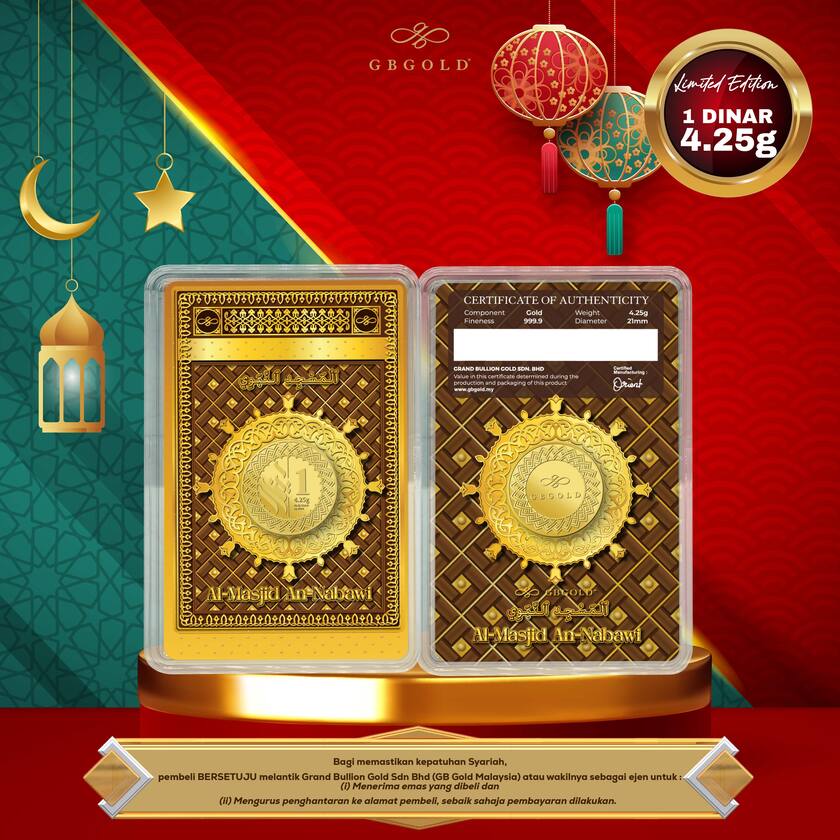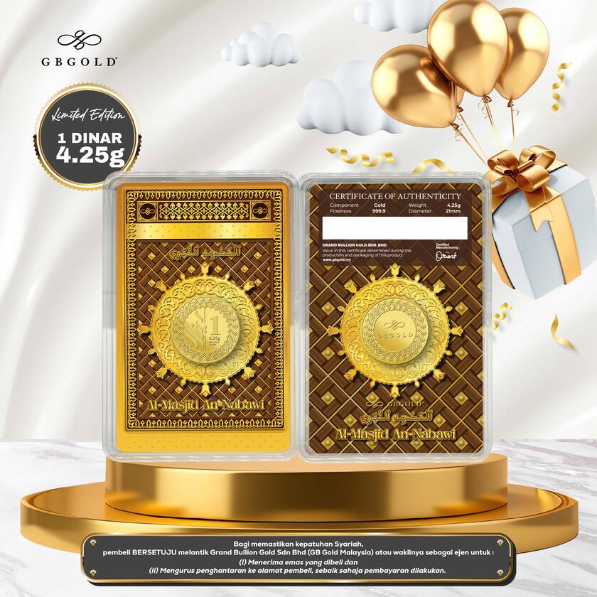 Introducing the GB GOLD An Nabawi 1 Dinar 4.25gm (Emas 999.9), the perfect addition to your collection of gold decorations and accessories. Crafted with 999.9/24K purity, this gold dinar is a must-have for any discerning collector.