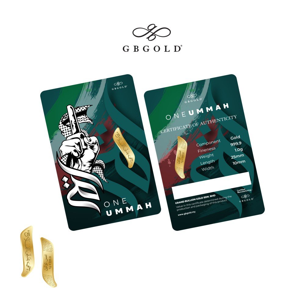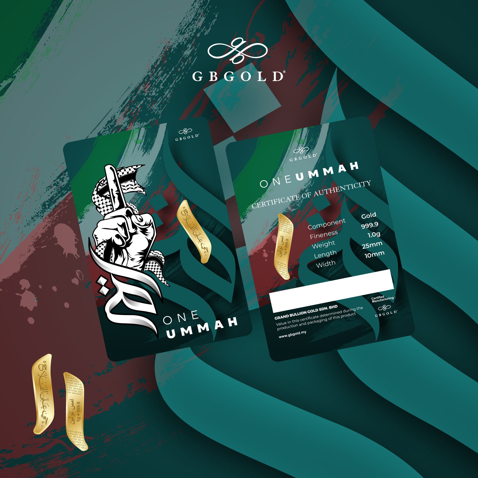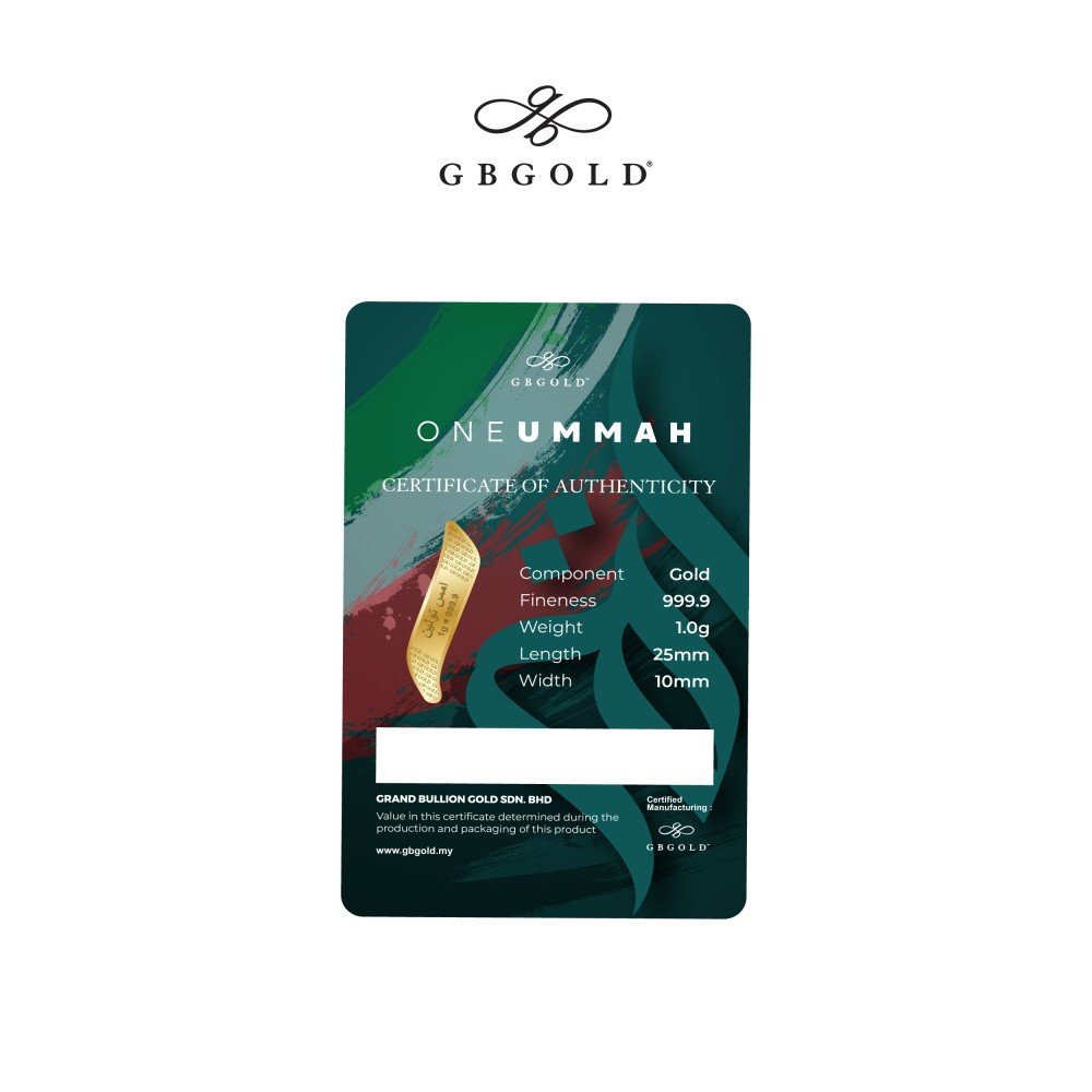 Introducing the GB Gold One Ummah Bar 1g (Emas 999.9), the perfect addition to your collection of gold decorations and accessories. Crafted with 999.9/24K purity, this gold bullion bar is a must-have for any discerning collector.
