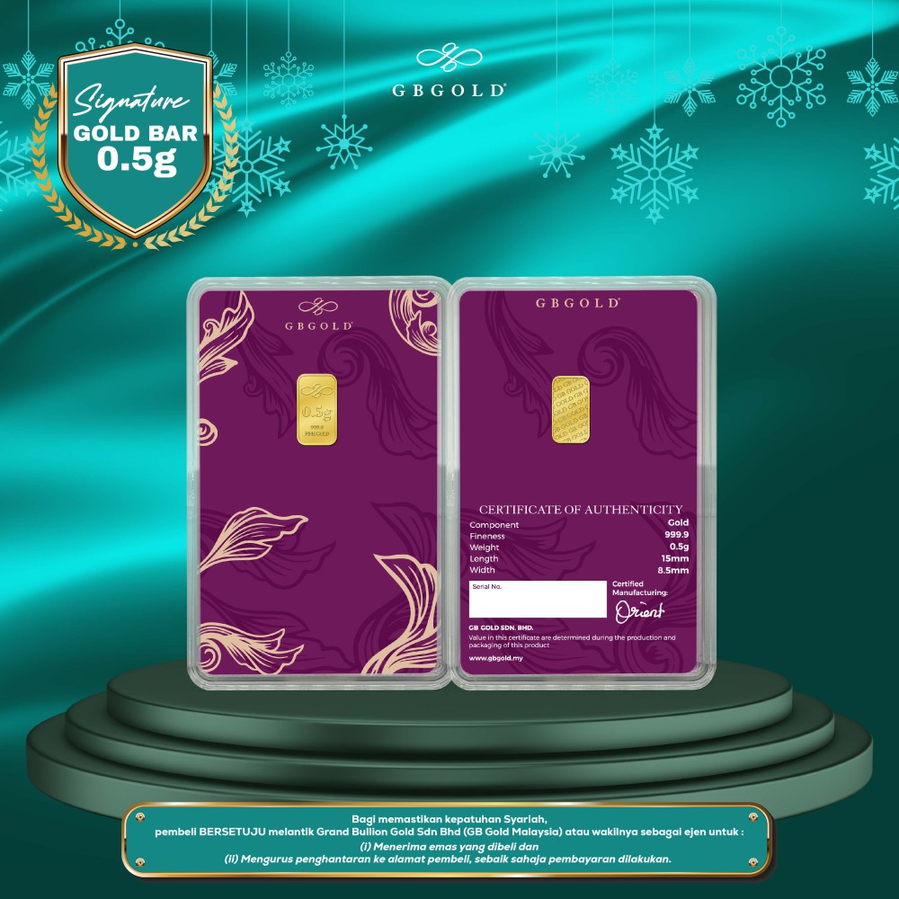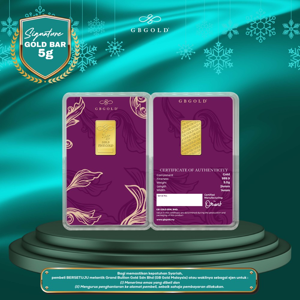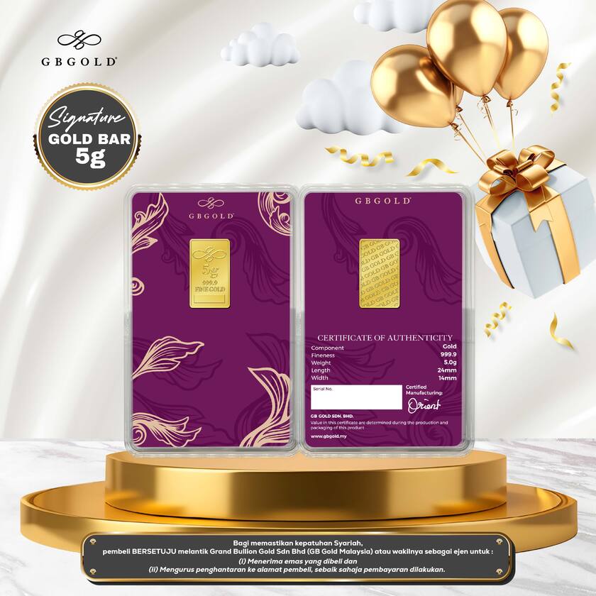 Introducing the GB GOLD Signature Gold Bar 5g (Emas 999.9), the perfect addition to your collection of gold decorations and accessories. Crafted with 999/24K purity, this gold bullion bar is a must-have for any discerning collector.