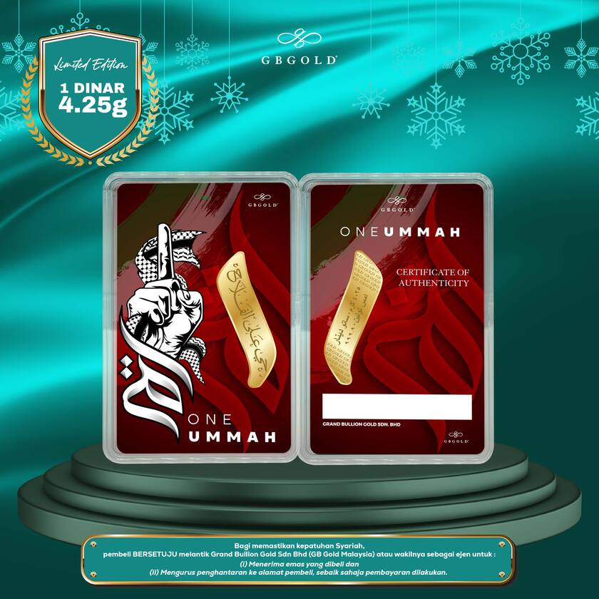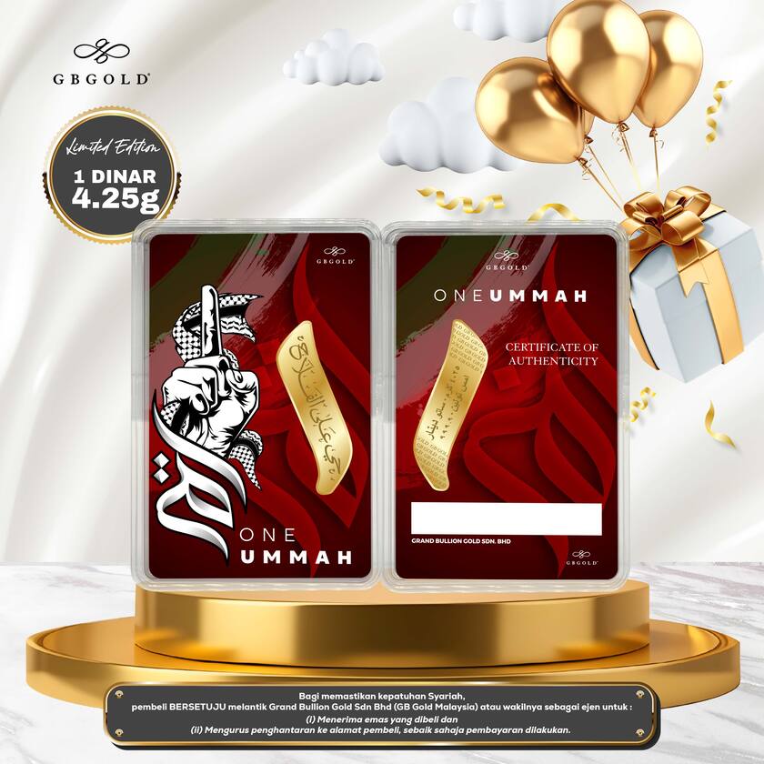 Introducing the GB Gold One Ummah 1 Dinar 4.25gm (Emas 999.9), the perfect addition to your collection of gold decorations and accessories. Crafted with 999.9/24K purity, this gold dinar is a must-have for any discerning collector.