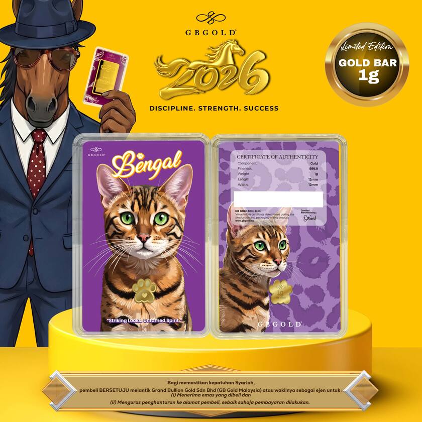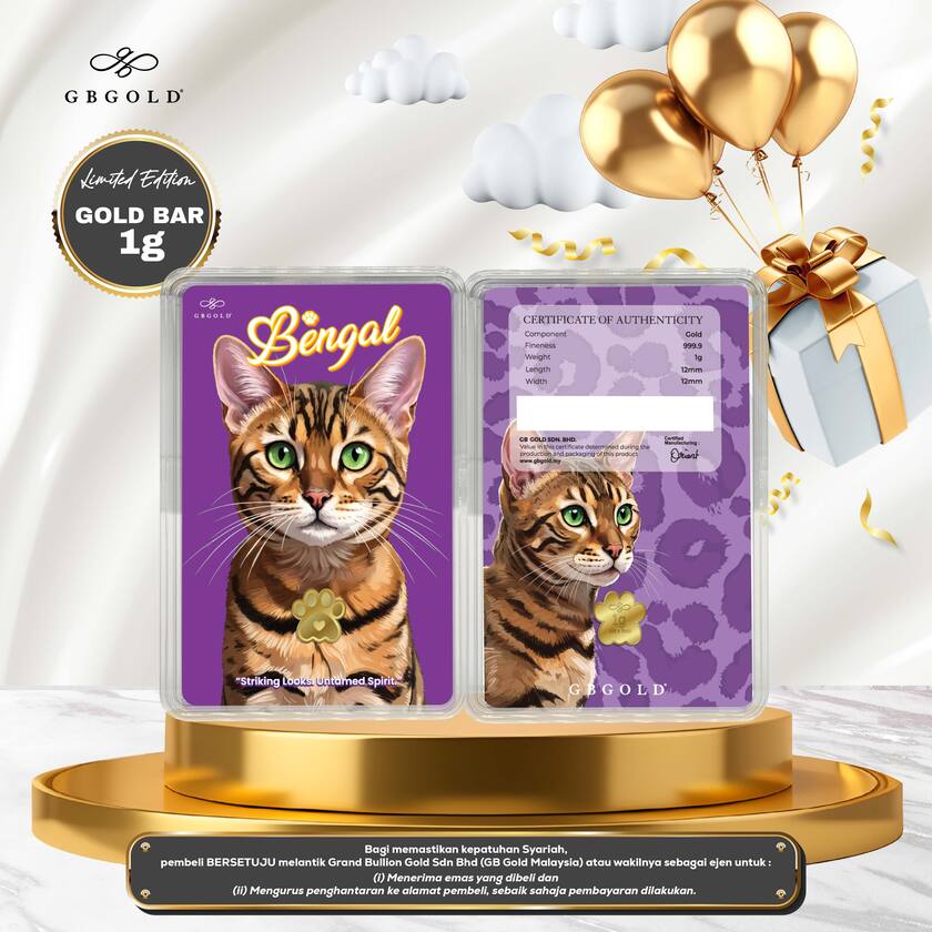 Introducing the GB Gold Cat Bengal Gold Bar - 1g (Emas 999.9), the perfect addition to your collection of gold decorations and accessories. Crafted with 999.9/24K purity, this gold bullion bar is a must-have for any discerning collector.