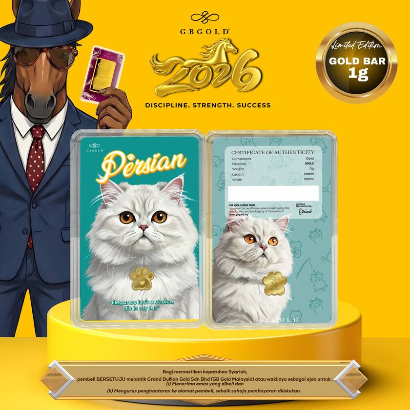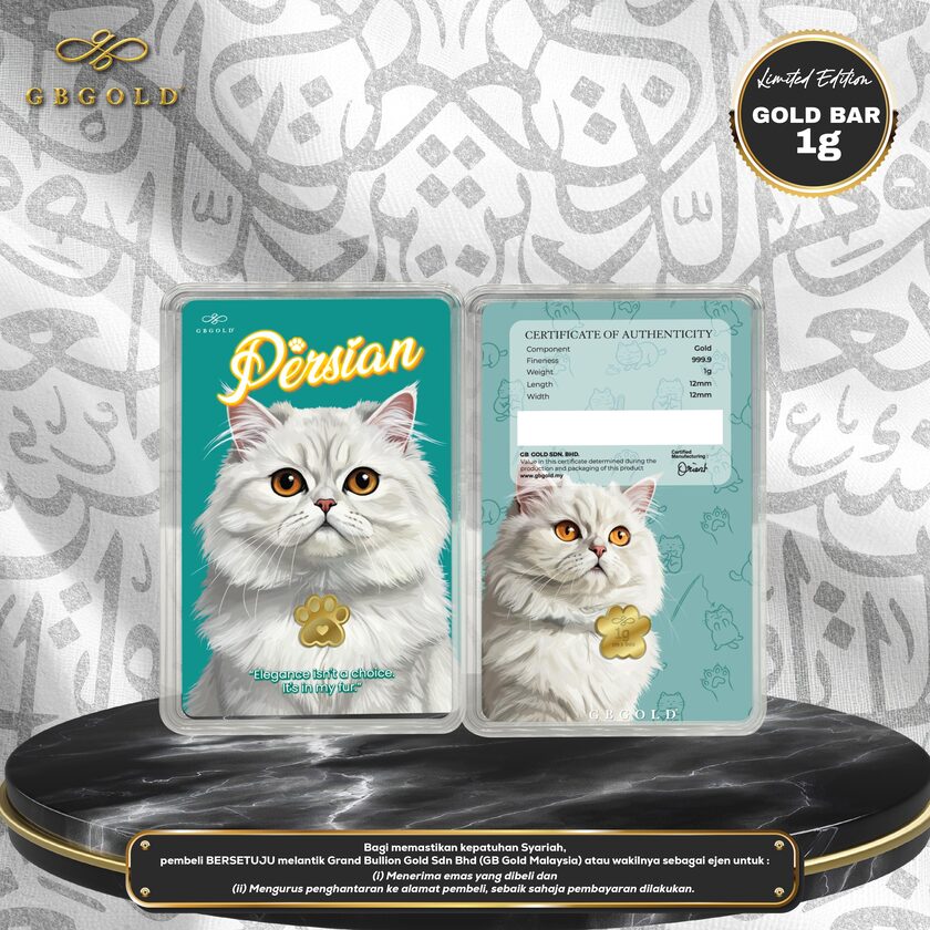 Introducing the GB Gold Cat Persian Gold Bar - 1g (Emas 999.9), the perfect addition to your collection of gold decorations and accessories. Crafted with 999.9/24K purity, this gold bullion bar is a must-have for any discerning collector.