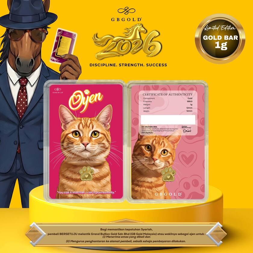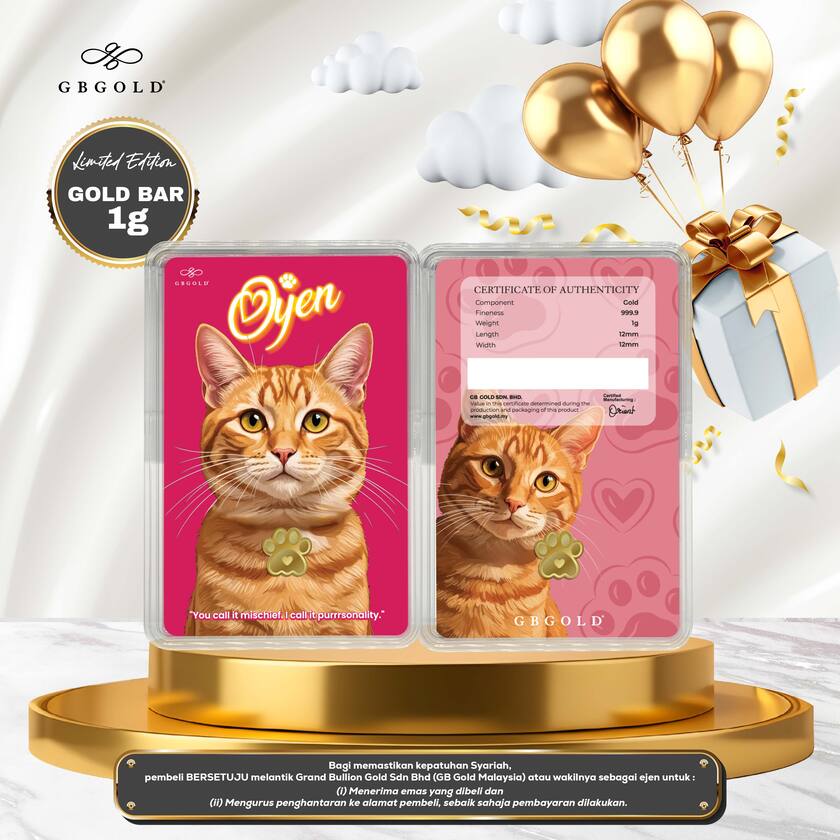Introducing the GB Gold Cat Oyen Gold Bar - 1g (Emas 999.9), the perfect addition to your collection of gold decorations and accessories. Crafted with 999.9/24K purity, this gold bullion bar is a must-have for any discerning collector.